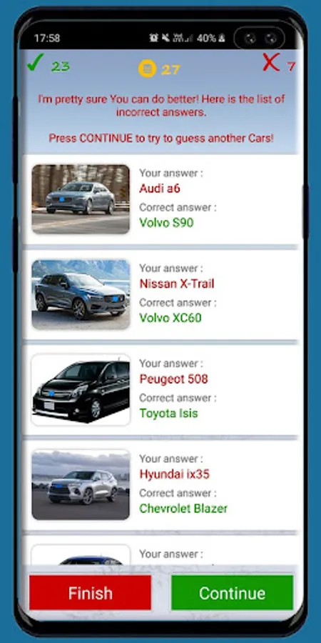 With this app You will discover a lot of model of your favorite makes, refresh in mind old makes or just enjoy watching cars images. If You don’t remember the make, it’s not a problem. The app will tell you your mistakes in the end of quiz.