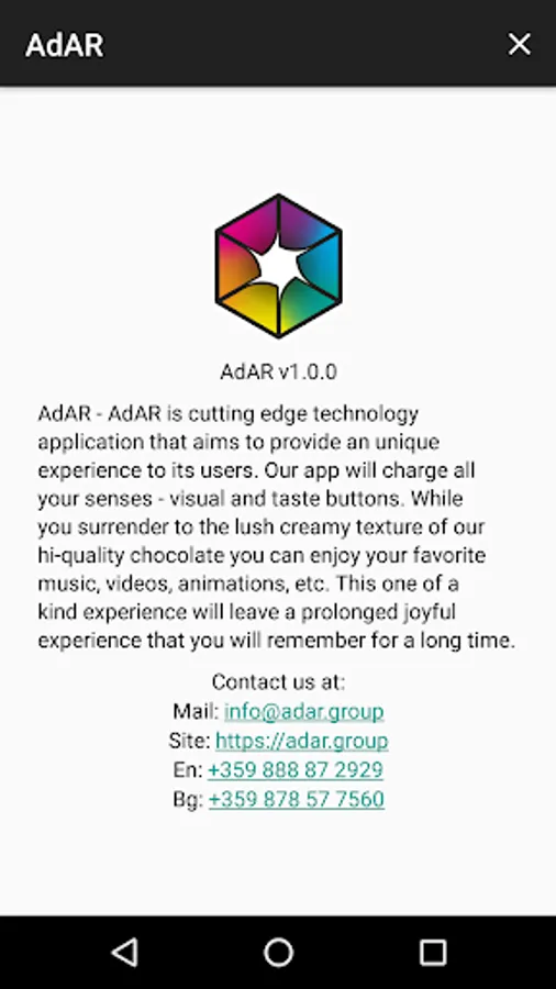 AdAR is cutting edge technology application that aims to provide an unique experience to its users. Our app will charge all your senses - visual and taste buttons. While you surrender to the lush creamy texture of our hi-quality chocolate you can enjoy your favourite music, videos, animations, etc. This one of a kind experience will leave a prolonged joyful experience that you will remember for a long time.