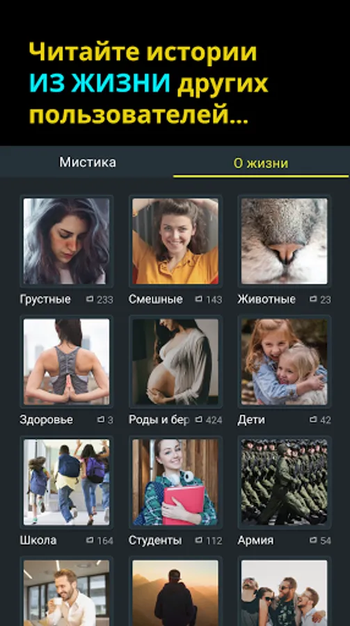 Every day in the app - hundreds of new touchy stories. These are stories from the lives of real people, love stories, humor, horror stories and much more. You can read stories of people on topics that interest you, get experience and new impressions.