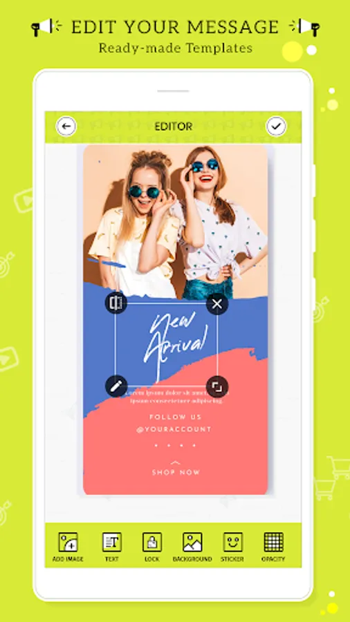 - Edit Your all templates and add image into a template, set text, set text position, change the background, Add Awesome Stickers, Give Opacity to stickers.