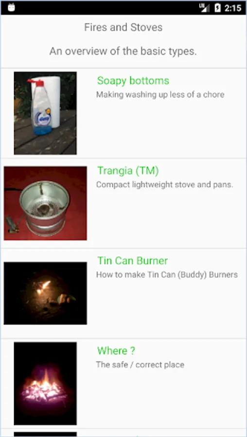 The App also provides an overview of basic camp stoves. There are a lot more, but this get started with the basics and will get you a good meal quickly. We use simple brick rocket stoves most terms at HQ, from burgers and sausages to badge work meal cooking.