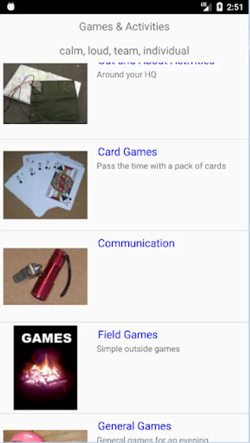 This App contains game ideas for Scouts and Cubs. Not all activities are suitable for both age groups. Most ideas will be suitable for other youth groups in those age ranges.