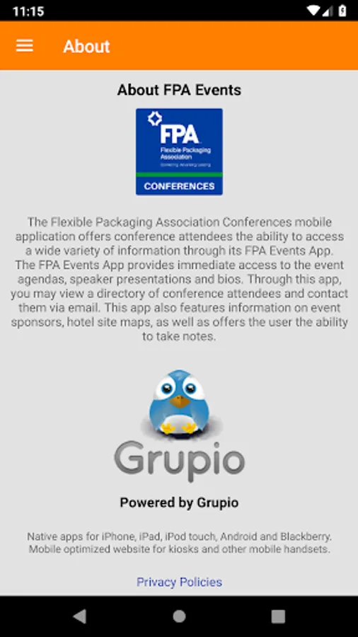The Flexible Packaging Association Conferences mobile application offers conference attendees the ability to access a wide variety of information through its FPA Events App. The FPA Events App provides immediate access to the event agendas, speaker presentations and bios. Through this app, you may view a directory of conference attendees and contact them via email. This app also features information on event sponsors, hotel site maps, as well as offers the user the ability to take notes.