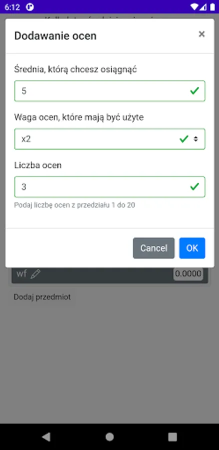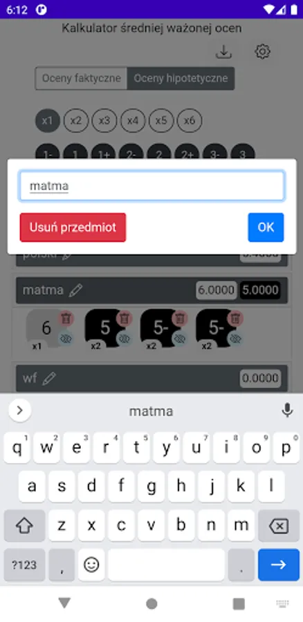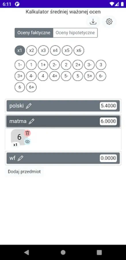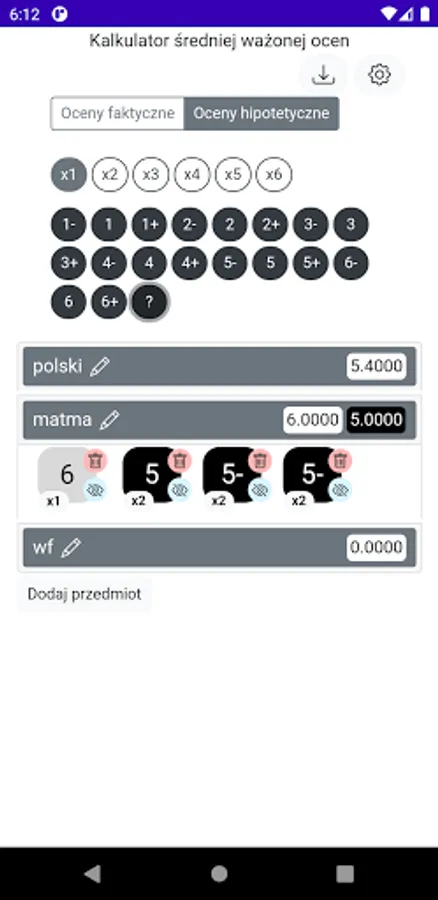 The calculator calculates the weighted or arithmetic average of grades in school subjects.