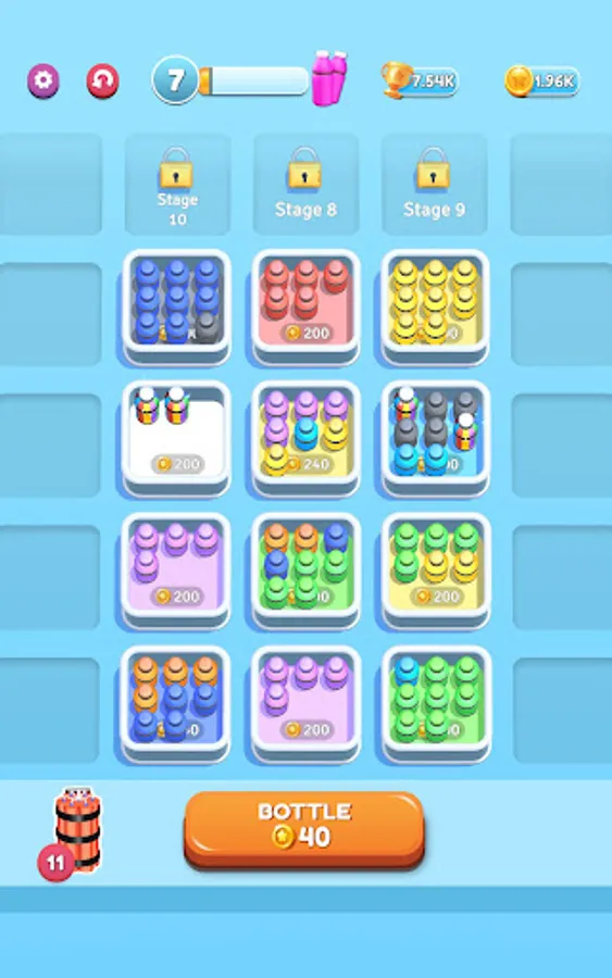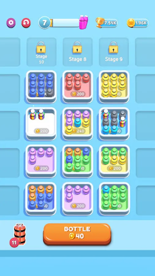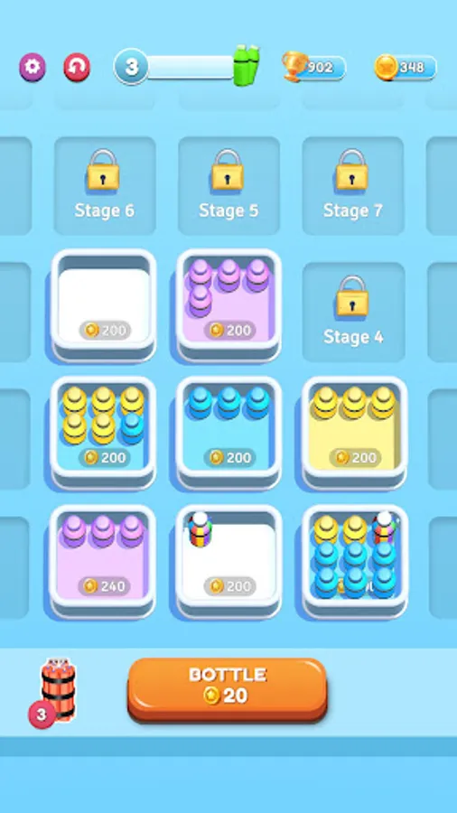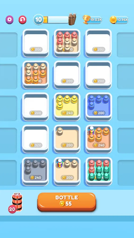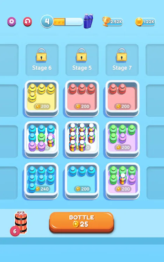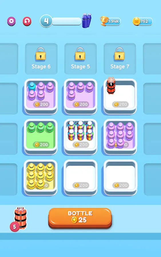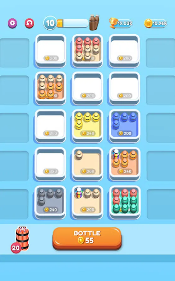 Colorful bottles are coming! We have to do something. Collect the same colors in a safe! You can destroy the bottles when the crate is full. Upgrade crates, get more coins when bottles are collected. Come on, this job is for you.