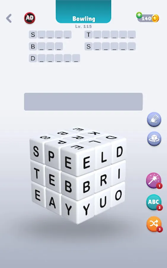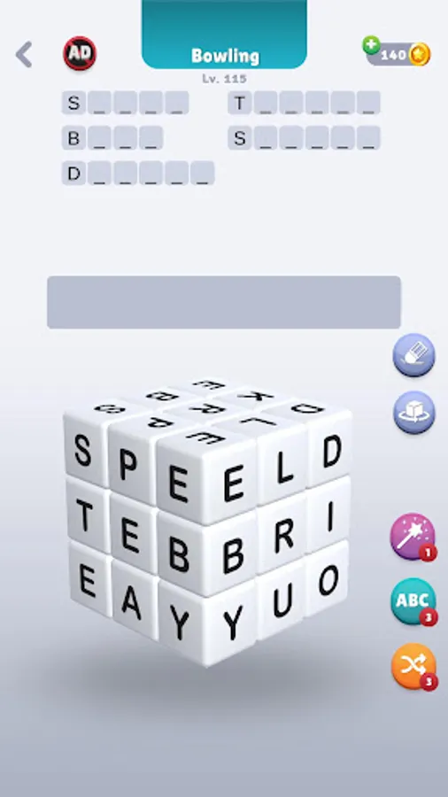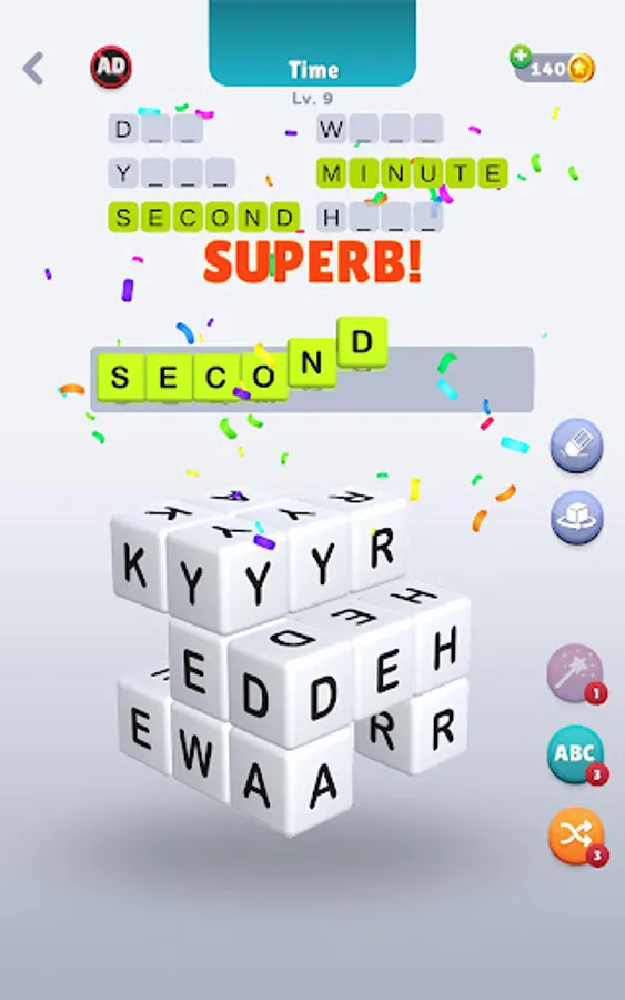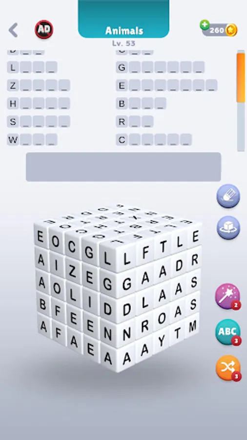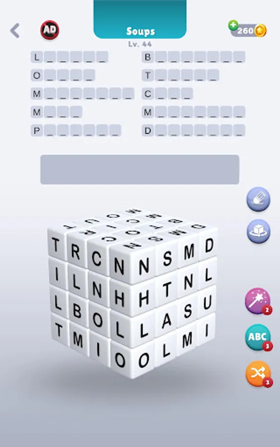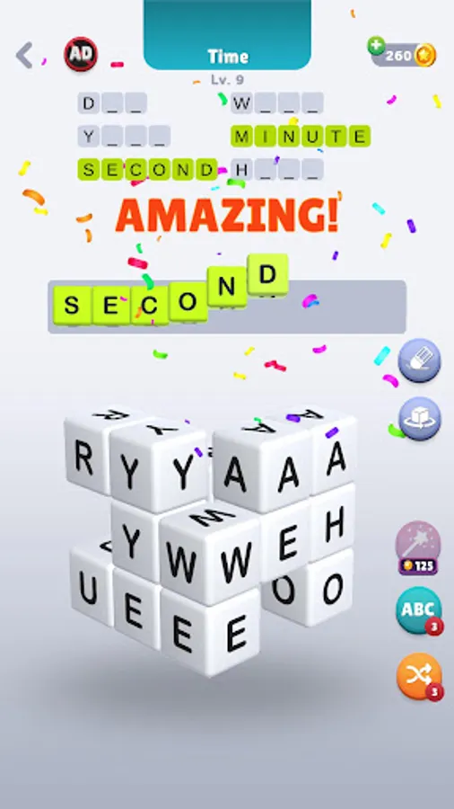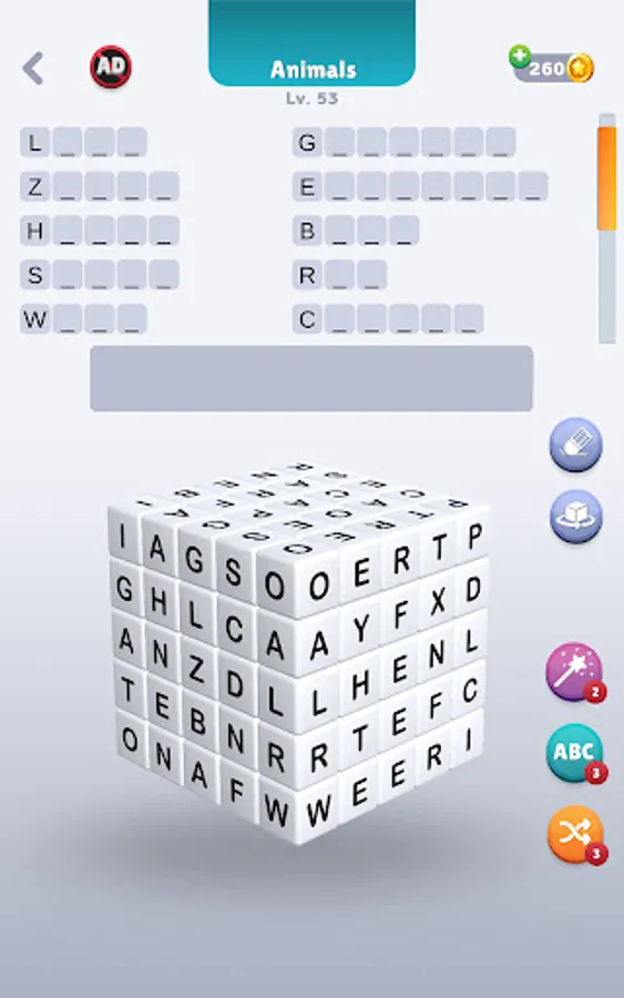 Find the words with the letters in the cube. You will clean all letters if discovering he right words that are hidden on the big cube.