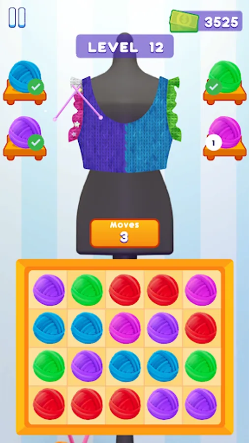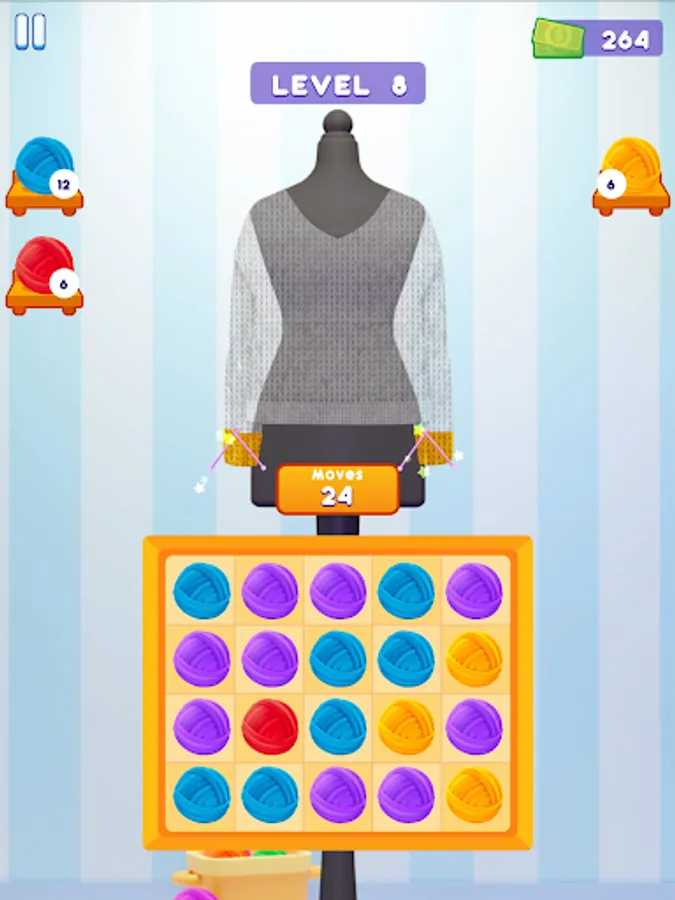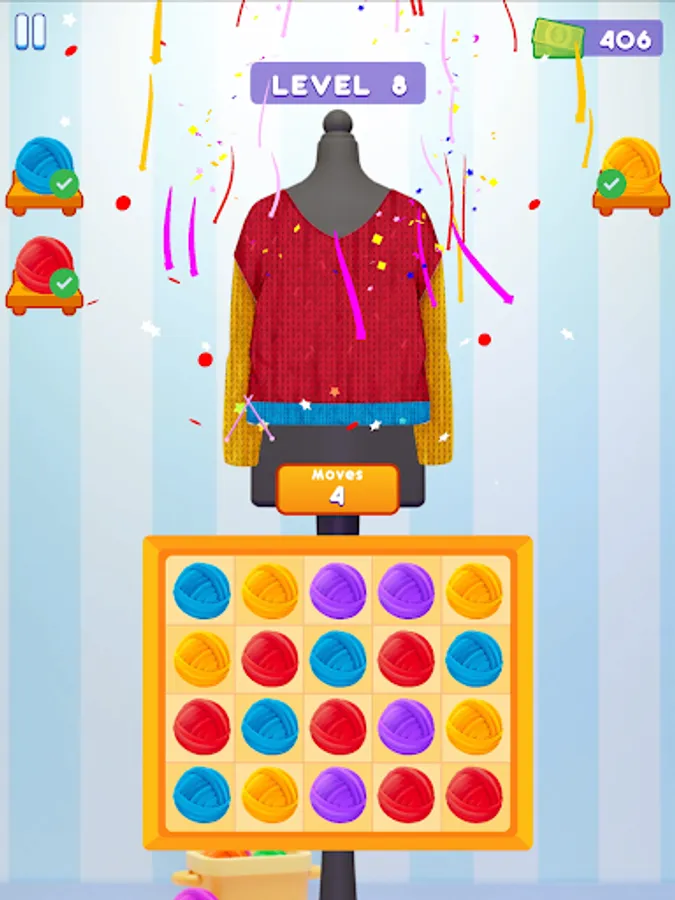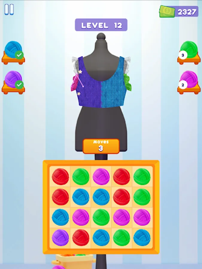 Match at least 3 wool threads and earn wool yarns of the same color. Watch the wool yarns knit the clothes according to the color and pattern on each clothing item. Try to make bigger matches at once to earn multiple yarns and finish knitting before you run out of moves!
