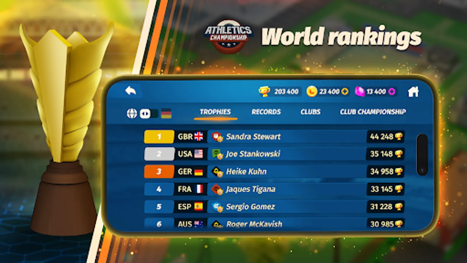 ● Duel players from around the world in athletics competitions and take their Trophies