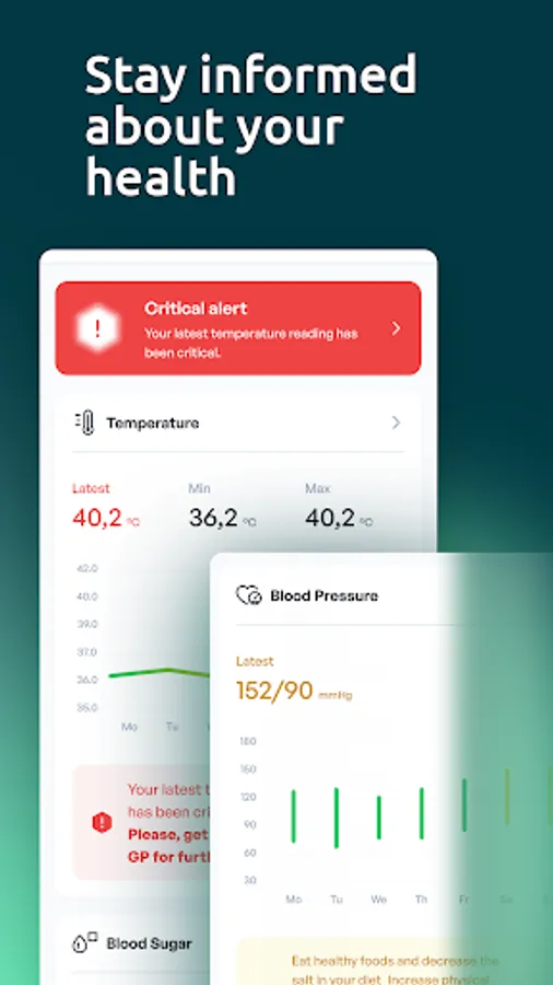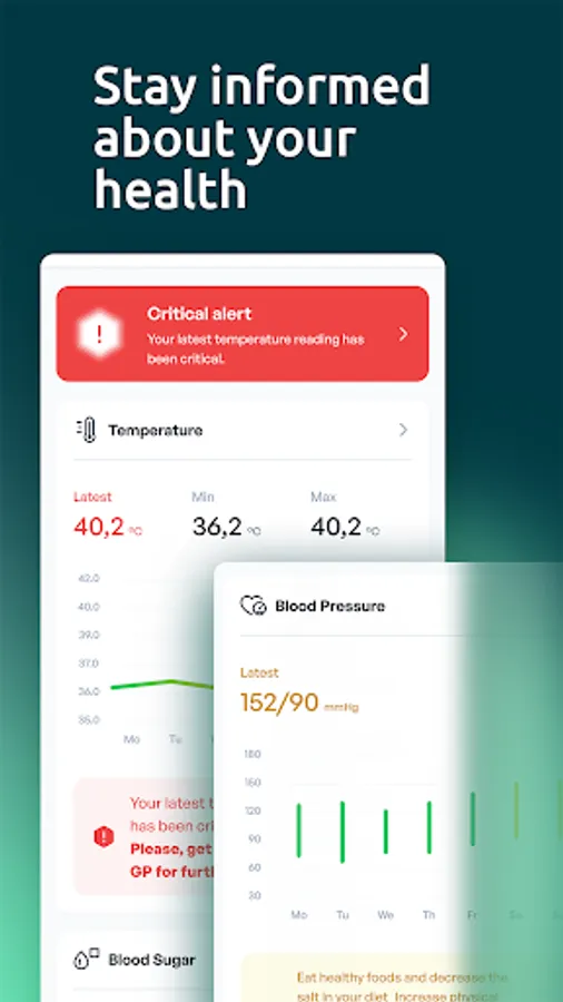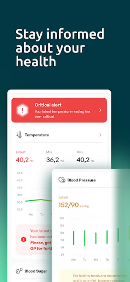 Telemedicine app allows you to share health data with your doctor and get real-time feedback. Early warning system detects changes and alerts medical staff who can help in case of deterioration.