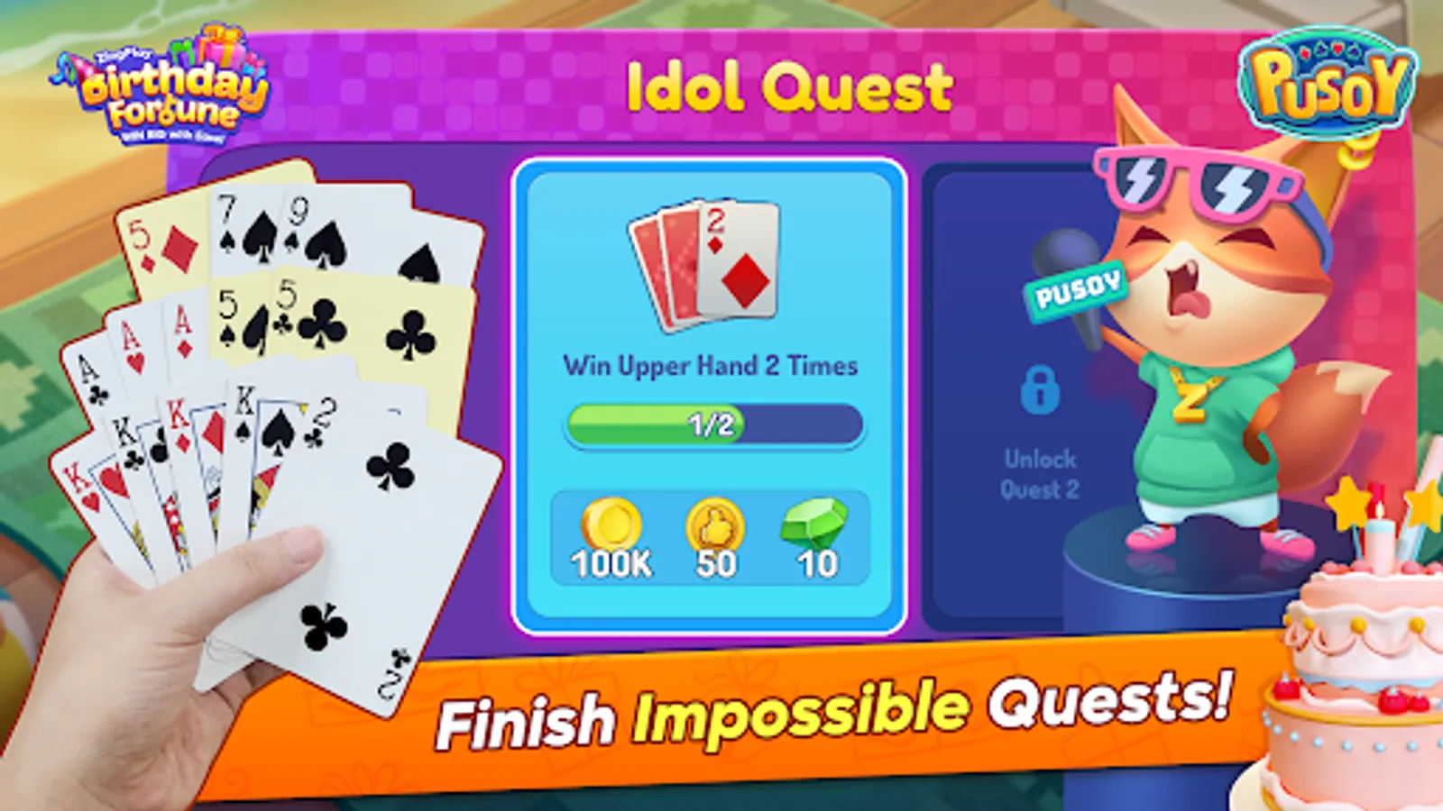Advance your skills with the series of Idol Quests. Finish all of them, from the easiest one - play 1 match - to the hardest, Pusoy all of the opponents. Complete to get extra gold and keep on playing.