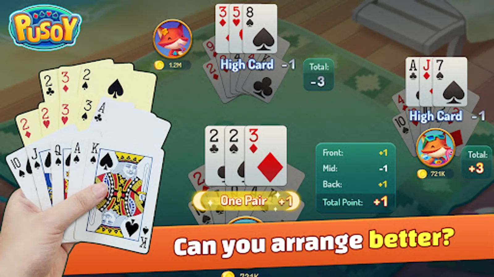 Improve your skills playing online Pusoy (also known as Chinese poker or 13 card game), the most exciting & competitive card game. The rules of Pusoy are simple. Arrange the given 13 cards into three poker hands - two of five cards and one of three cards. But can you arrange it better? To outsmart your given cards and Pusoy the opponents!