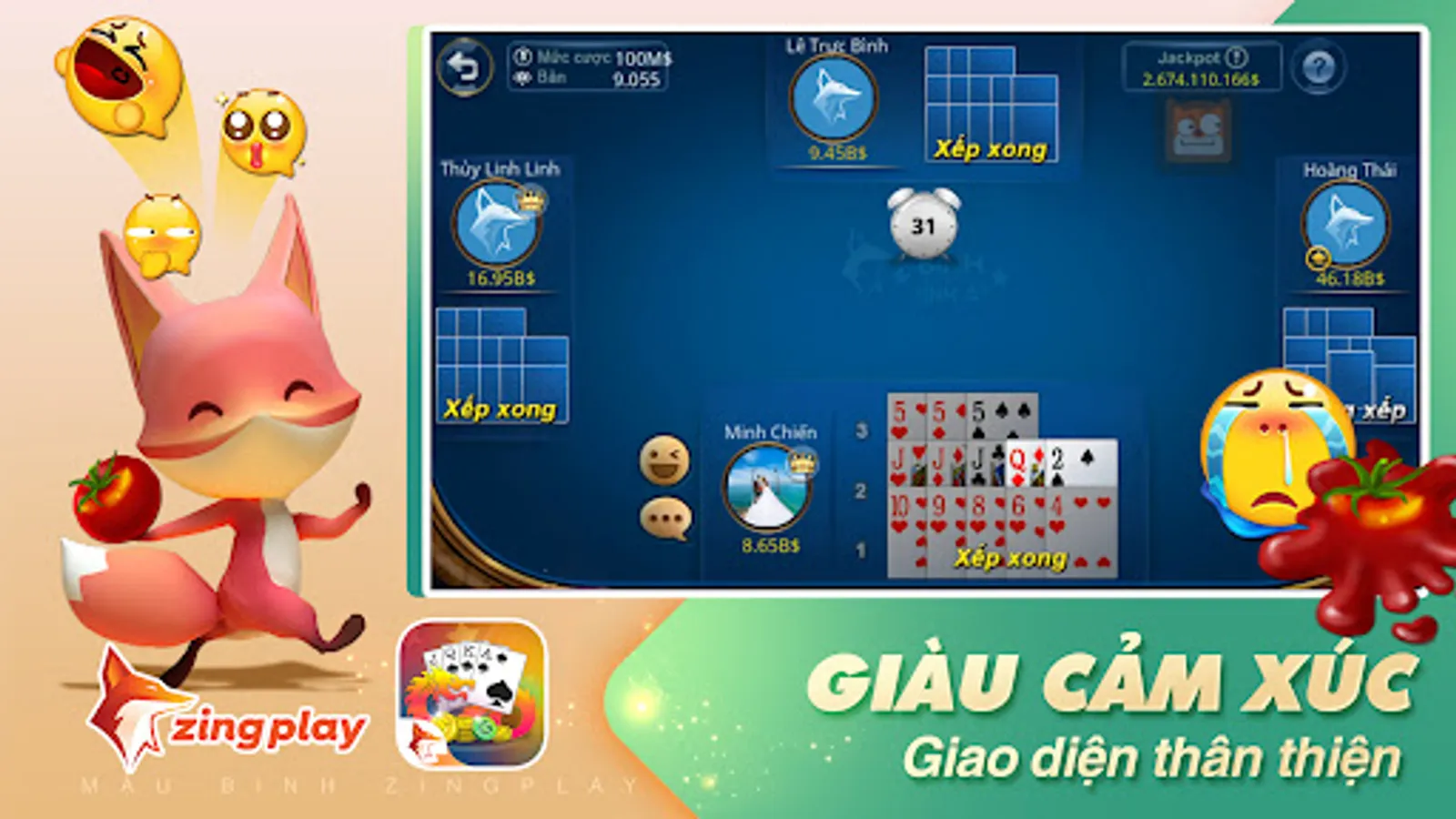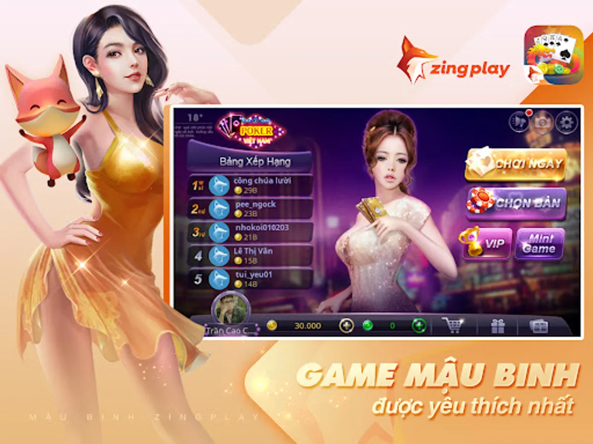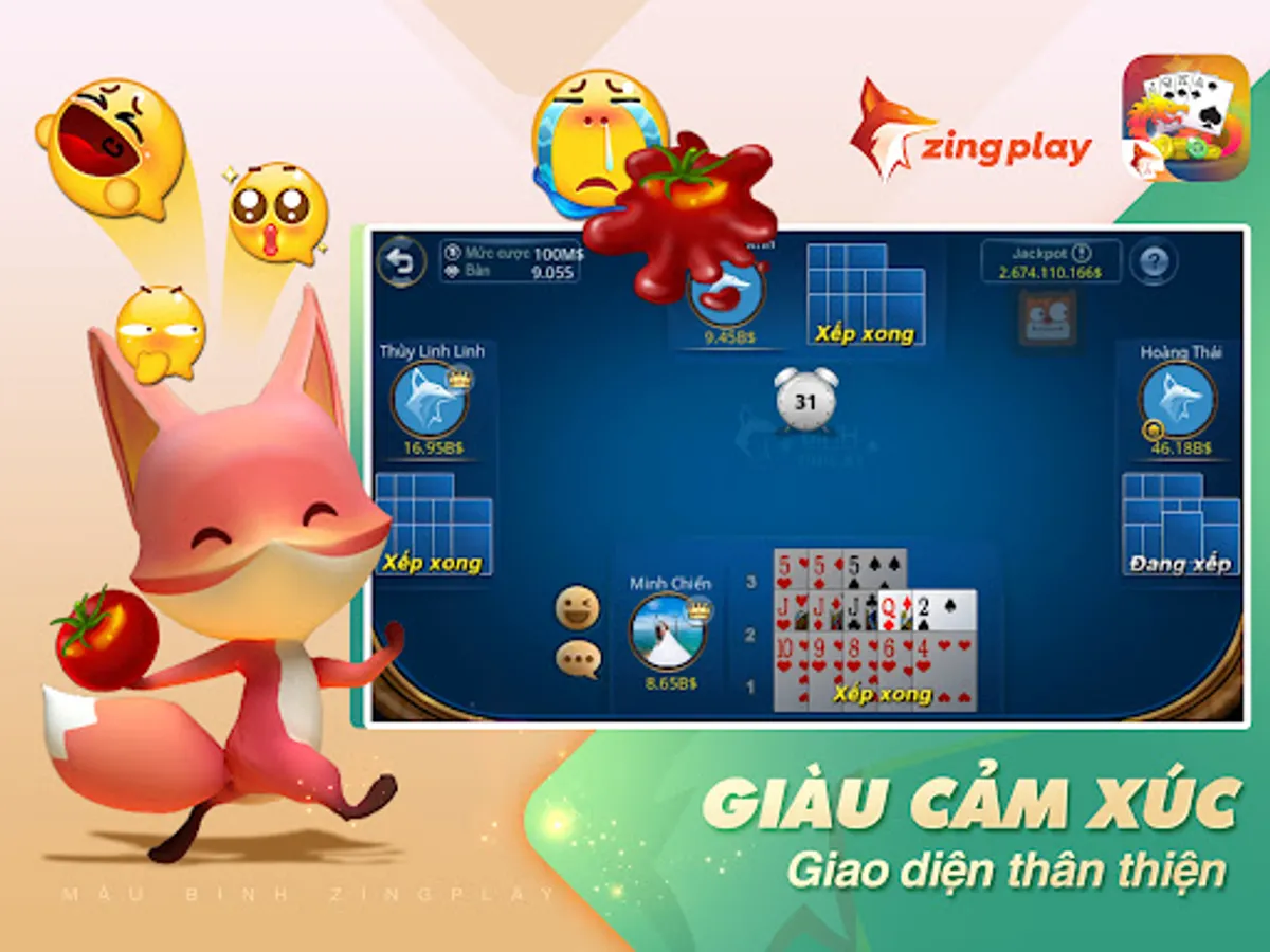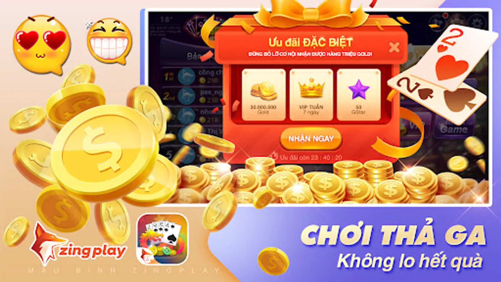 Mậu Binh ZingPlay tặng vàng miễn phí hàng ngày. Thoải mái trải nghiệm trò chơi mà không lo lắng về việc nạp thẻ.