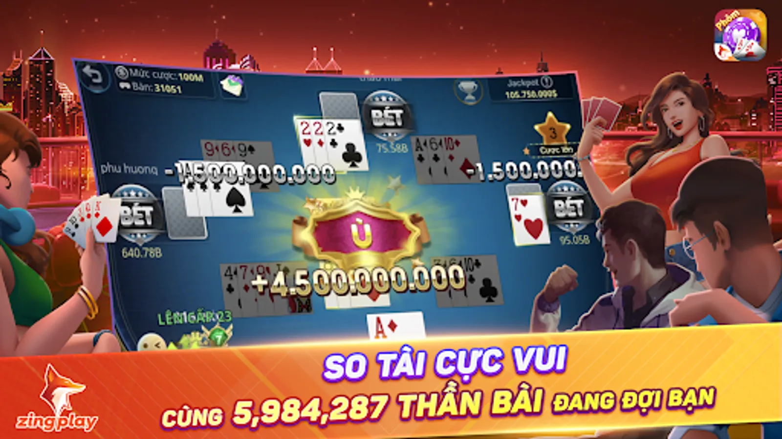 Tu Lo Kho - Ta La (Ta la) or Phom (Phom) is one of the favorite card games of ZingPlay - The first multi-platform entertainment portal launched in Vietnam. Players can play Ta La - Phom (Ta la - Phom) ZingPlay directly on the web, or download the game to play on Mobile. Play with computers, laptops and play on all phones, all operating systems ... And no matter what device you play on, these accounts are connected to each other very conveniently. Ta La game (Ta La, Phom, Phom) is played a lot in Vietnam, when playing Ta La (Ta la), players need to consider how to find a way to eat cards and drop trash to make a set of cards called Phom as well. such as minimizing the total score of cards that are not in phom. The game gives players logical thinking, decisiveness, wisdom, and pragmatism to apply to life when they have to continuously "read" the opponent's mind through each move. Players can also launch blind fire, hit the opponent's psychology to win. With a beautiful interface, effects, vivid sound, light game, smooth play on most operating systems, the game Ta La - Phom (Ta La - Phom) of the entertainment game portal ZingPlay has become a software not to be missed. indispensable on the phone of gamers who love to experience the thrill and attraction. In particular, as a product of ZingPlay, belonging to the Zing brand, which has been affirmed for many years by players, coming to Ta La Zing Play, the interests of the players come first, you are not Worry about losing gold, lose chips during play. DOWNLOAD Ta La - Phom (Ta La - Phom) NOW & GET $50,000 NOW TO START WITH ZINGPLAY YOU! The game is intended for mature players. The game does not support "real money betting/trading" nor does it support cash prizes. Experience of playing or winning at a social card game does not mean winning in real money betting/trading activities in the future. VNG rated 18+ - "Playing games for more than 180 minutes a day will adversely affect health."