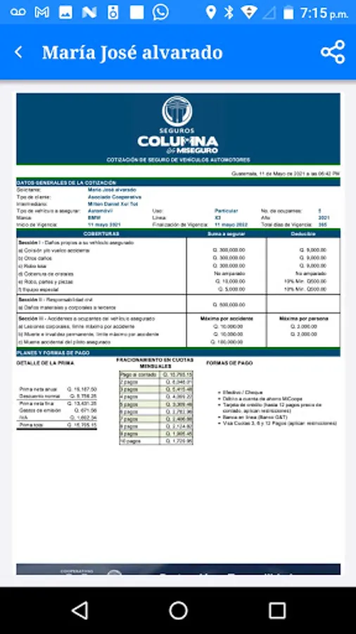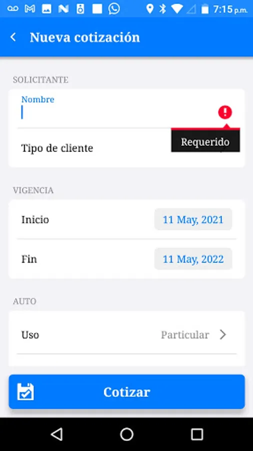 APP that allows the user, once registered, to capture the information necessary to calculate the Price for vehicle or life insurance. It allows you to view the quote in PDF and send it by email through different communication channels. Allows the user to edit the quote and send it back to the customer. It also allows you to manage your different quotes within the application. Tool designed to increase productivity in insurance sales.