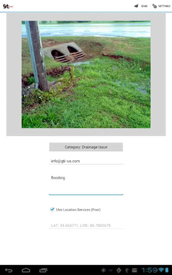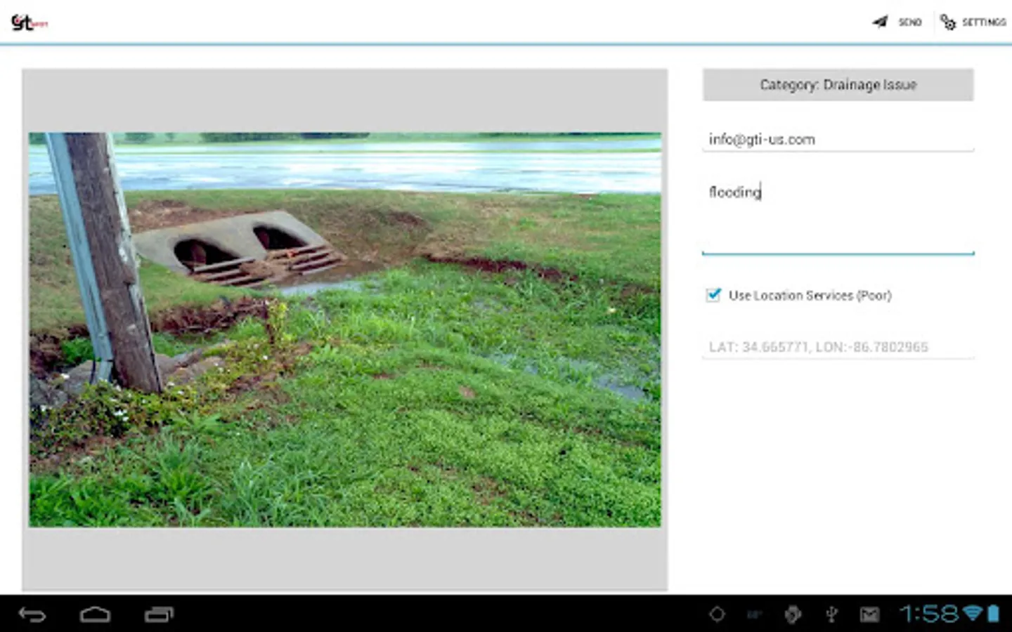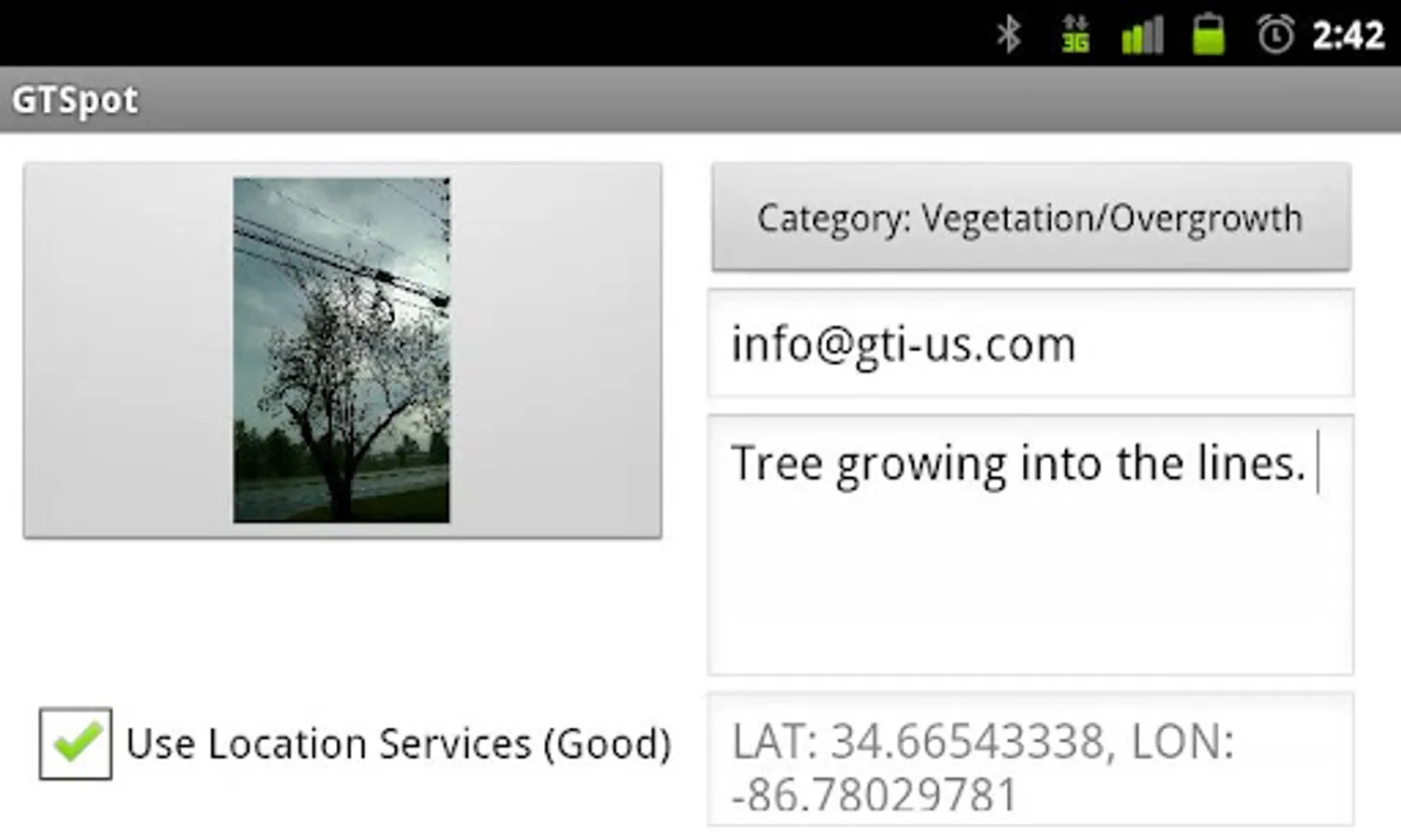 GTSpot facilitates crowdsourced, incident reporting. Users can quickly and easily report a Problem, Damage, Issue, or Observation with a photo, note, and geographic location. These reports are send to a GTWeb Server and can be used in conjunction with GTWeb or independently.