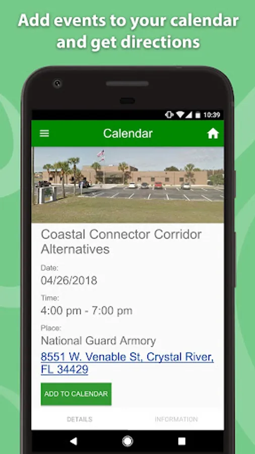Each section contains a concise summary, and may provide supporting images, documentation and links. The Calendar section provides a list of upcoming public events, with interactive addresses (click for directions) and dates (add to personal calendar). Contacting the project team is easy through the Stay Connected section, with phone numbers (click to call) and e-mail addresses (click to send).