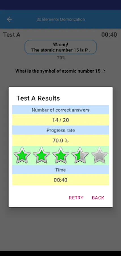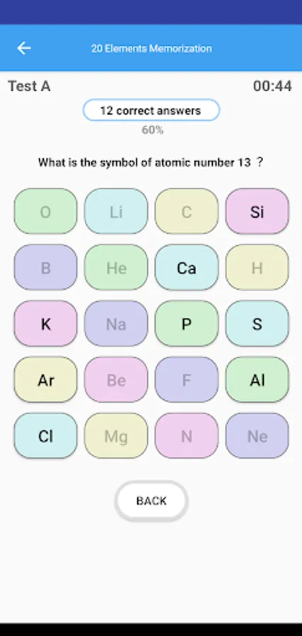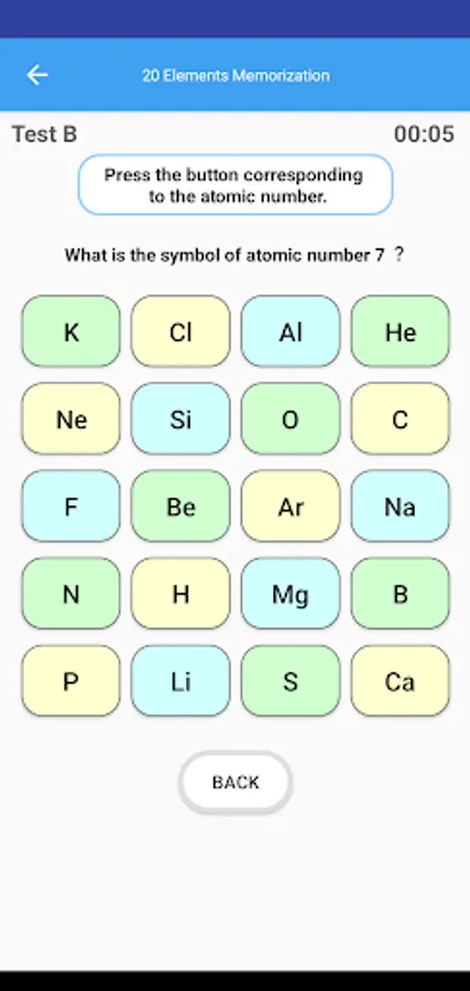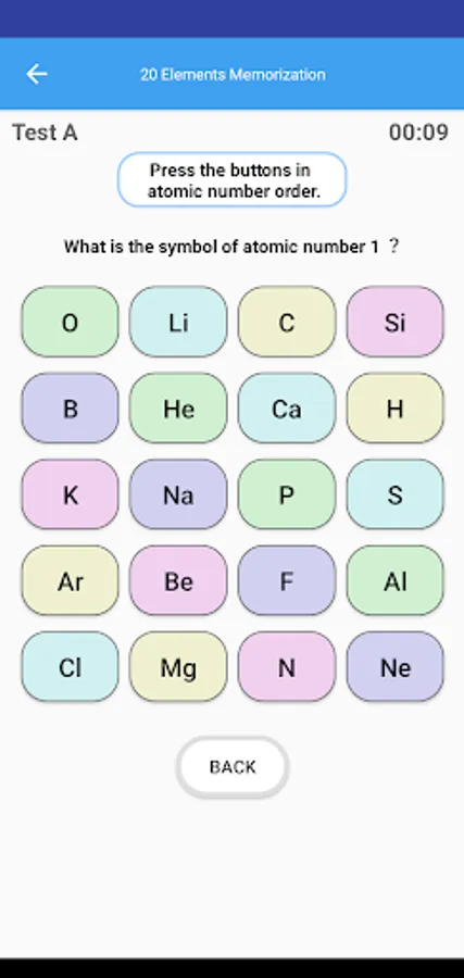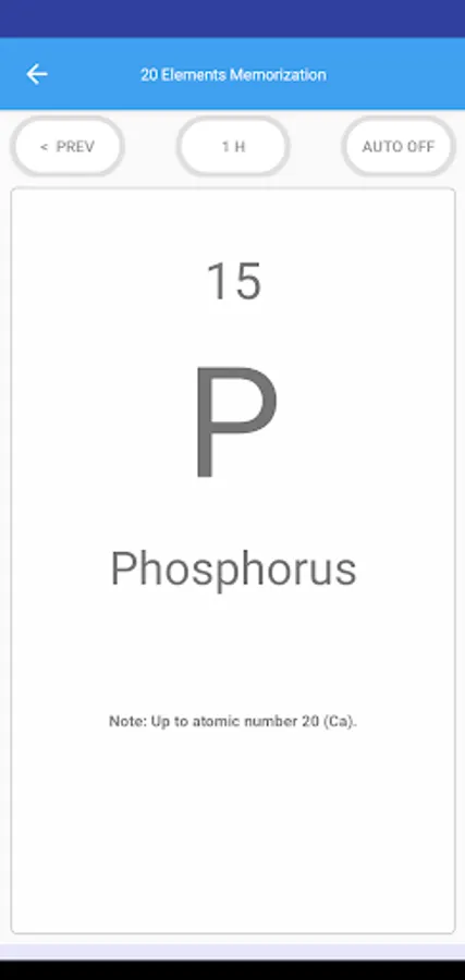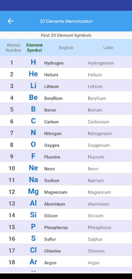 This application supports memorizing chemical element symbols from atomic number 1 hydrogen (H) to atomic number 20 calcium (Ca).