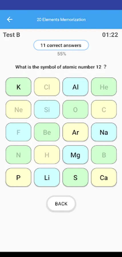 Flashcards can be tapped to display the following chemical element symbols to support memorization tasks.