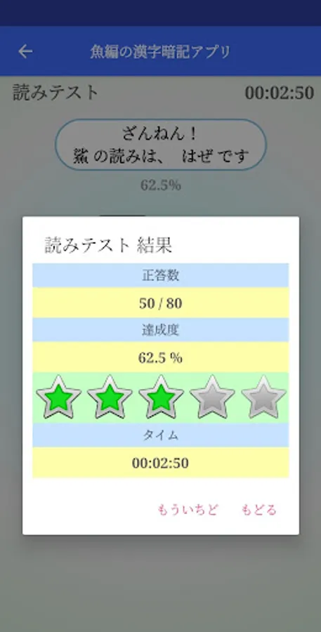 The number of correct answers and time are measured, and the test result dialog is displayed.