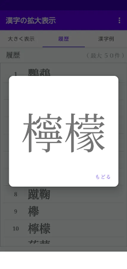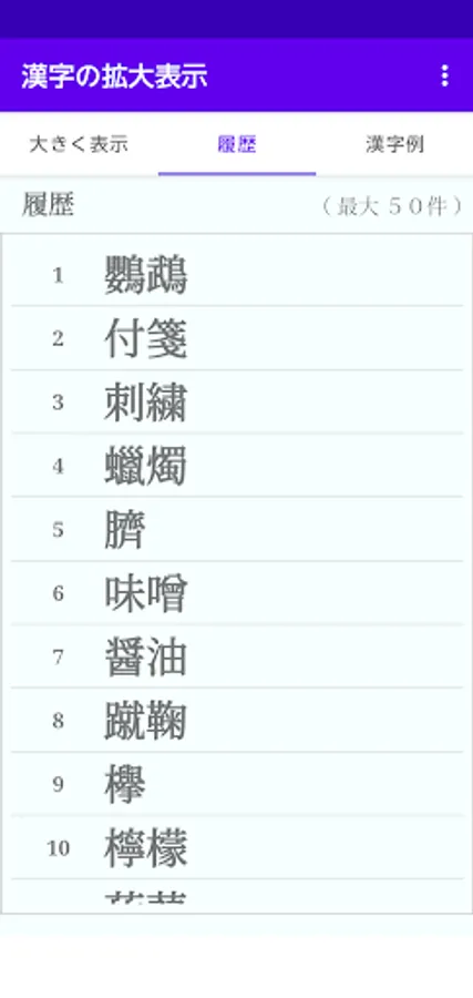 Once displayed, the Chinese characters are posted on the history tab and can be enlarged with a single tap. (Maximum 50 cases)