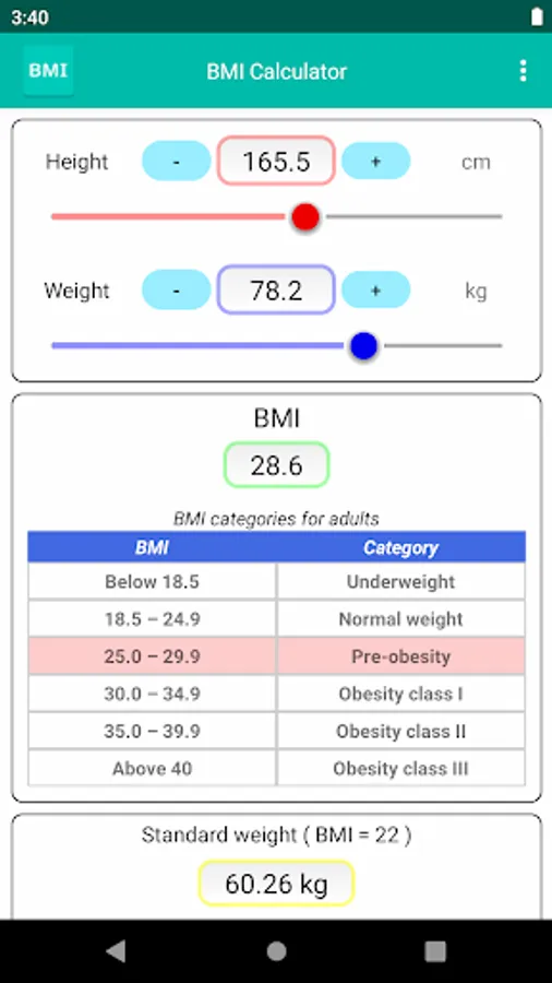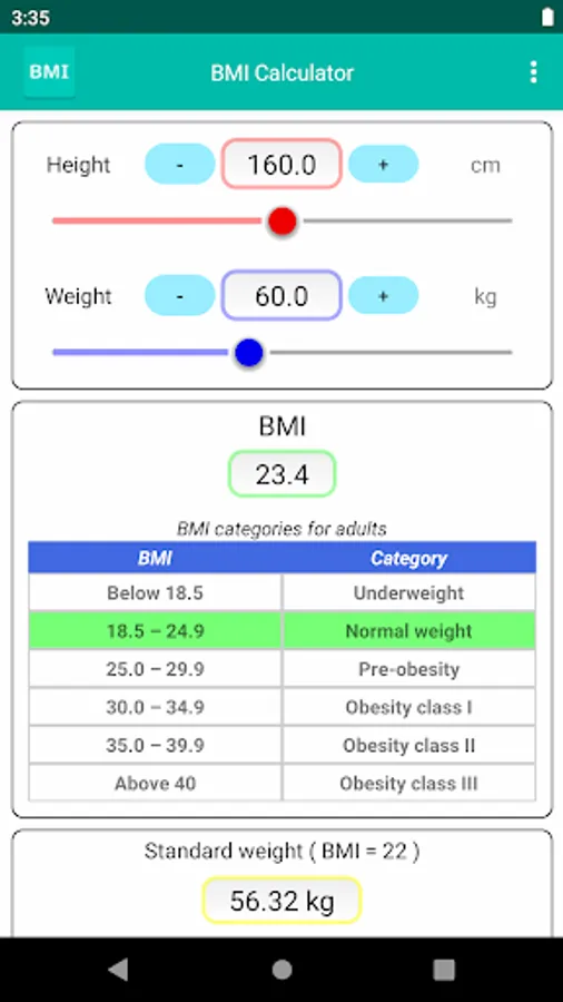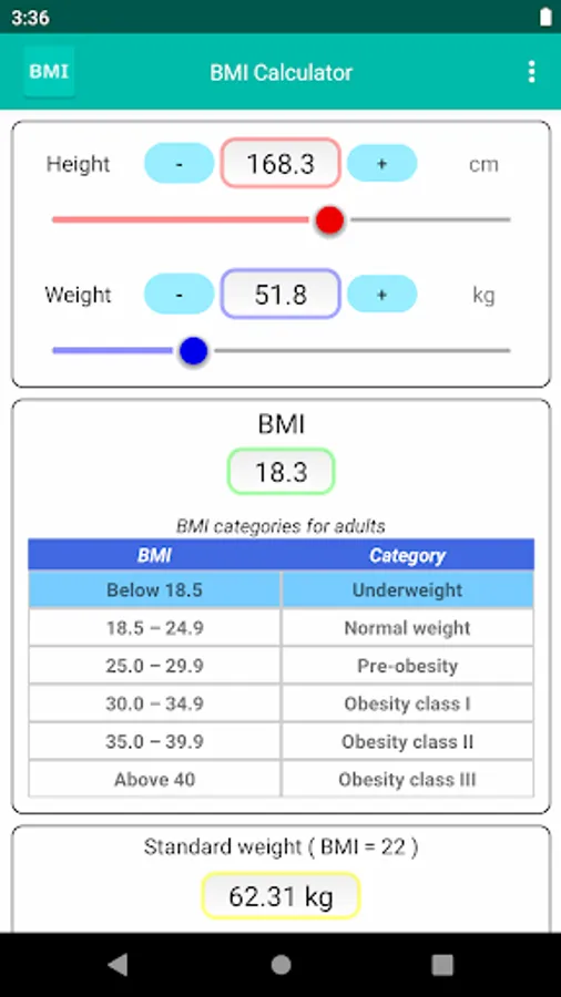 This BMI calculator uses two seek bars, height and weight, to display the BMI calculation results immediately.