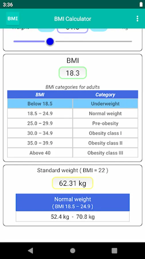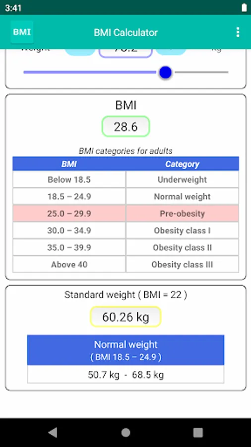 Displays the standard weight of a healthy and ideal BMI of 22.