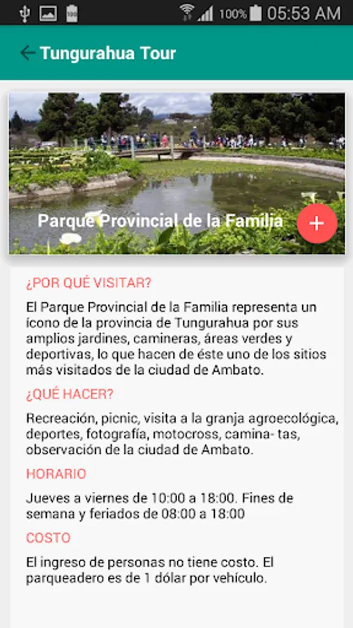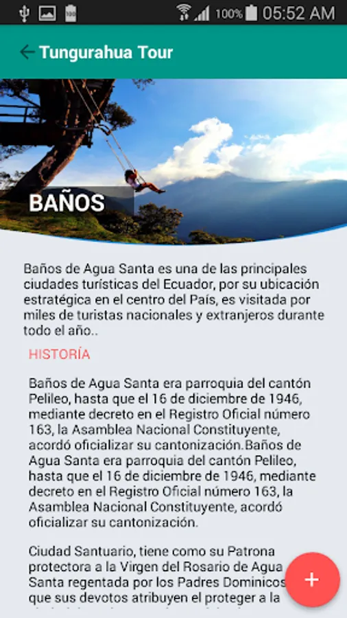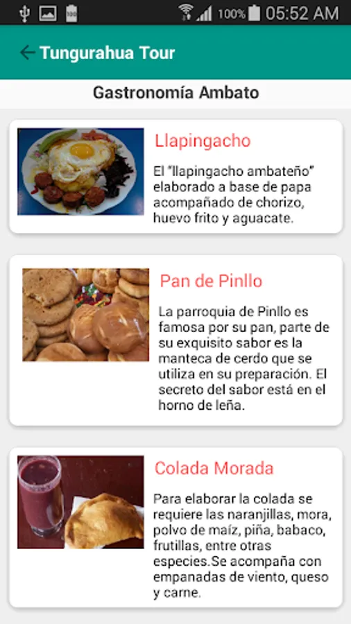 The application's main objective, to allow users of it, knowing didactically tourism sectors Tungurahua province can offer lovers of tourism. In the same way it will help you observe all information related to gastronomy of each of the Cantons of this province in the center of the country. This application is designed for people, whether Ecuadorian or foreign, that fascinates them know tourist spots and / or taste typical dishes that can be offered in each of the cities.