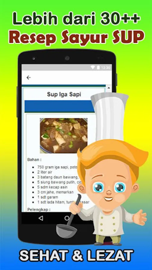 Aplikasi Resep Sup Lezat memberikan 30 menu pilihan dengan menu sup yang bervariasi dan sehat untuk dihidangkan di setiap waktu, antara lain Resep;