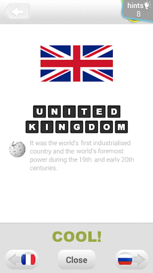 "Flags Quiz" is a free game full of fun that consists on guessing the names of hundreds of countries flags from around the world.