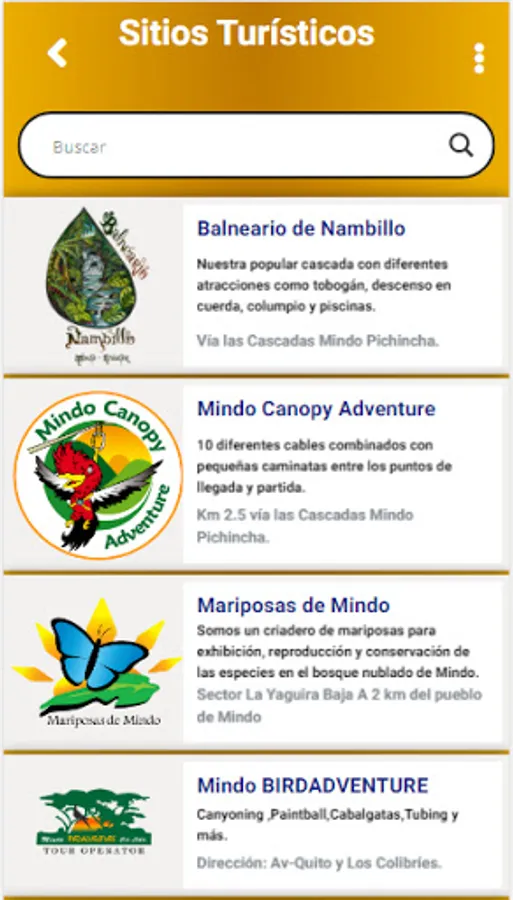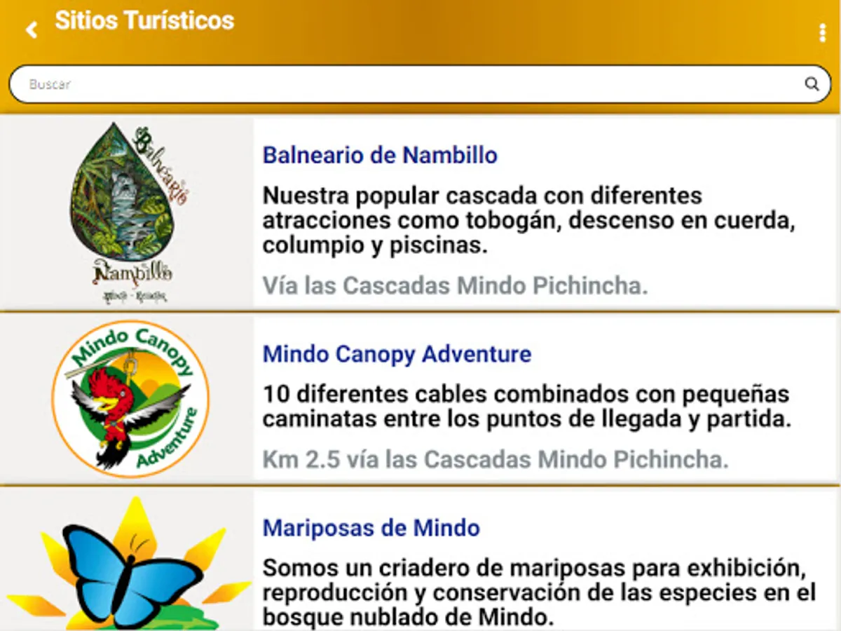 In this application you can find detailed information on each business located in Mindo with its respective GPS address, contact numbers, images, videos and more.