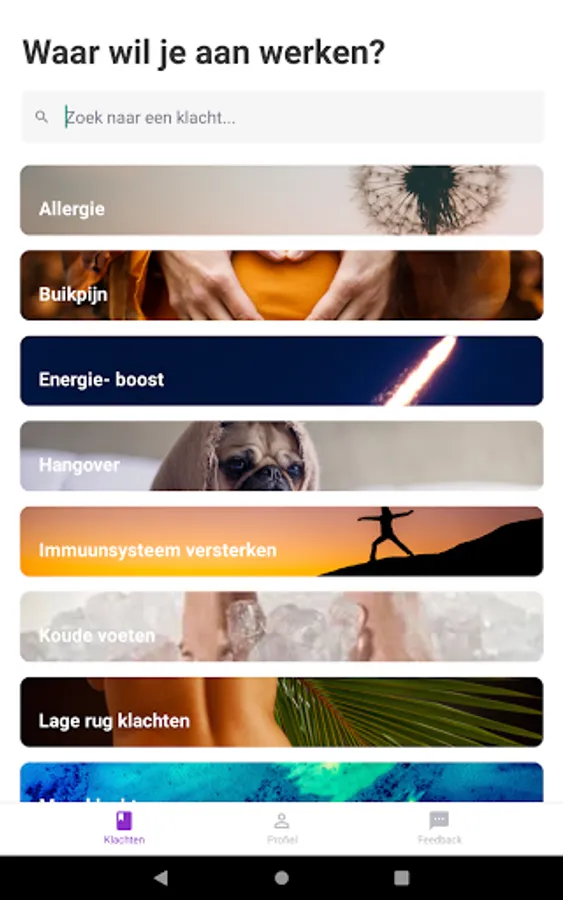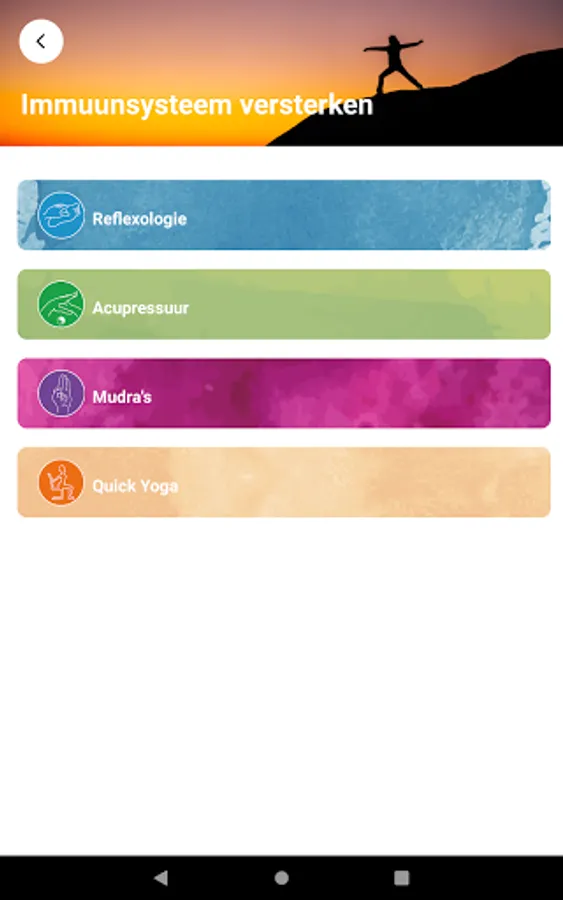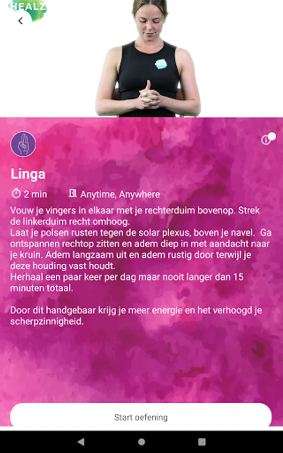 HEALZ is an accessible and practical app for everyone with complaints ranging from minor ailments such as mild stress or a hangover to more serious medical problems such as back or neck complaints. HEALZ offers simple but effective exercises and tailor-made step-by-step plans to make your complaints disappear. The exercises are based on a combination of different ancient healing methods, namely: reflexology, acupressure, (quick) yoga, mudras and chakras.