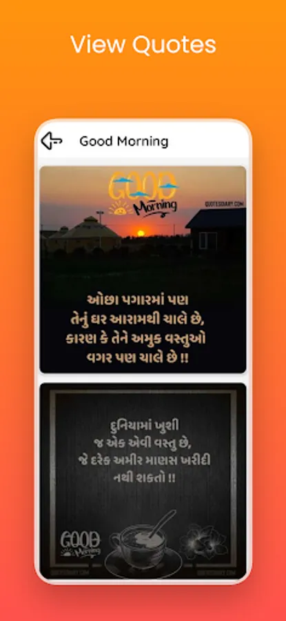 Gujarati Quotes & Suvichar Status App has a simple user interface with the Latest quotes with categories.
