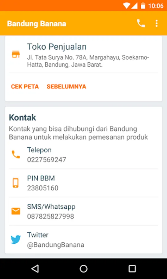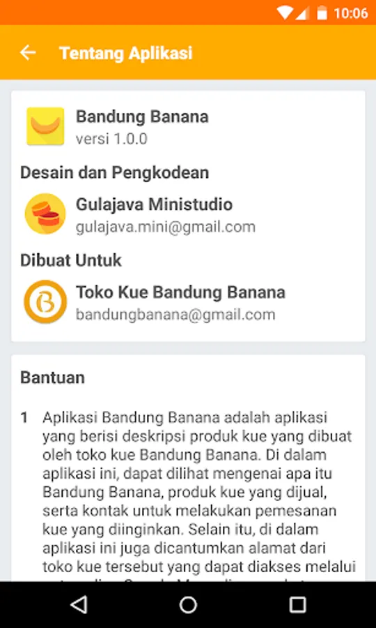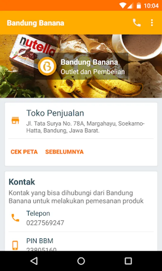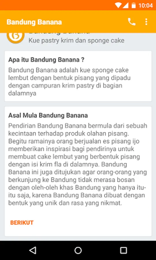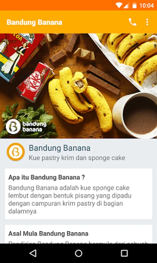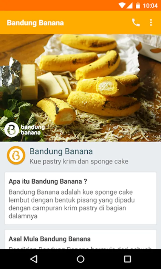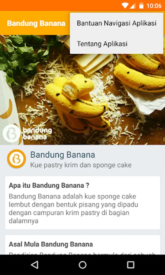 Bandung Banana application is an application that contains product descriptions cake made by pastry shop Bandung Banana. In this application, it can be seen on what Bandung Banana cake products are sold, as well as the contact for the desired cake book. In addition, in this application also listed the address of the pastry shop which can be accessed via online maps in the user's device.