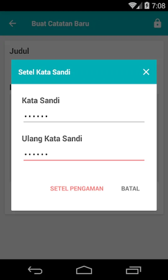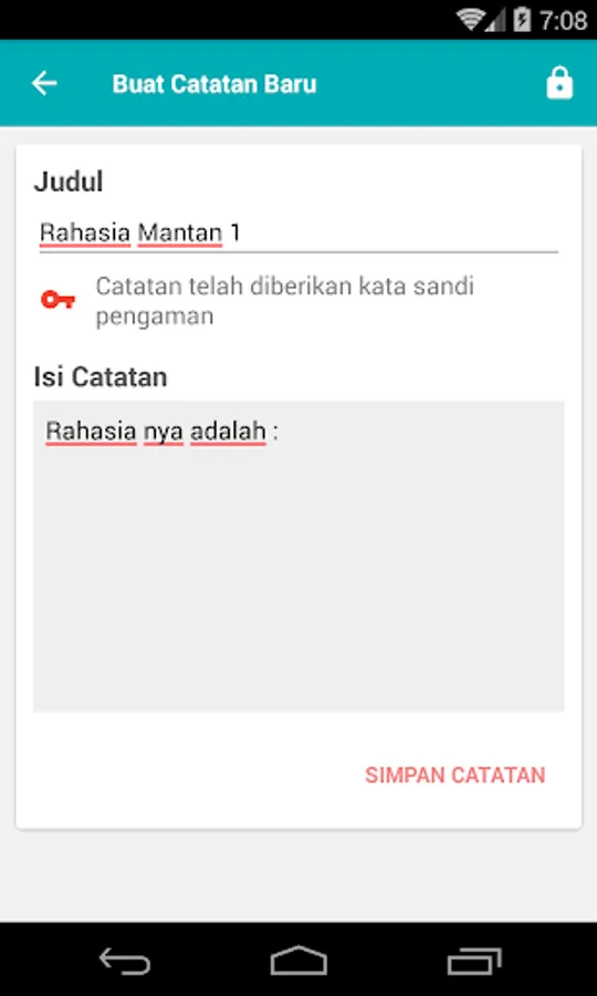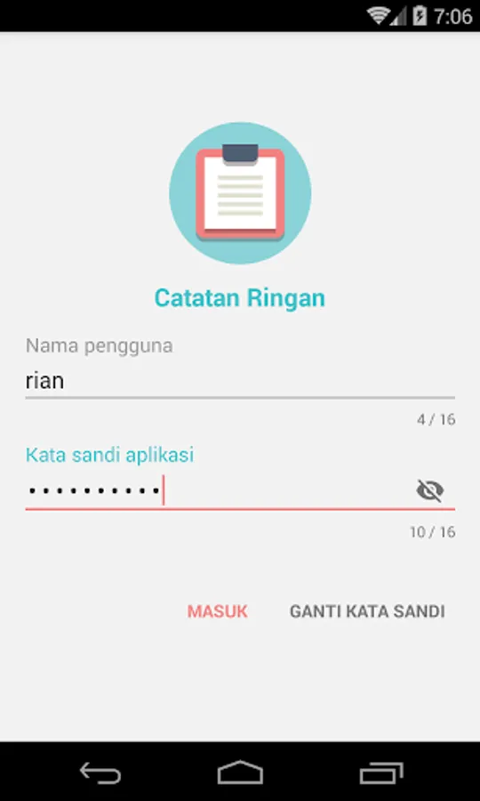 This application is an application that serves to record data in the form of short text and can be saved by using a password or a password so that only people who know the password to open it.