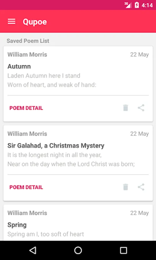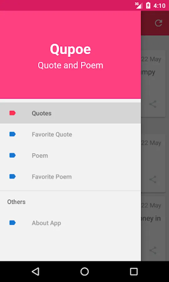A simple application that contains a collection of quote and poetry from several sources. Quotes provided from of several well-known films and also of famous persons. As for poetry available from several authors that are grouped alphabetically.