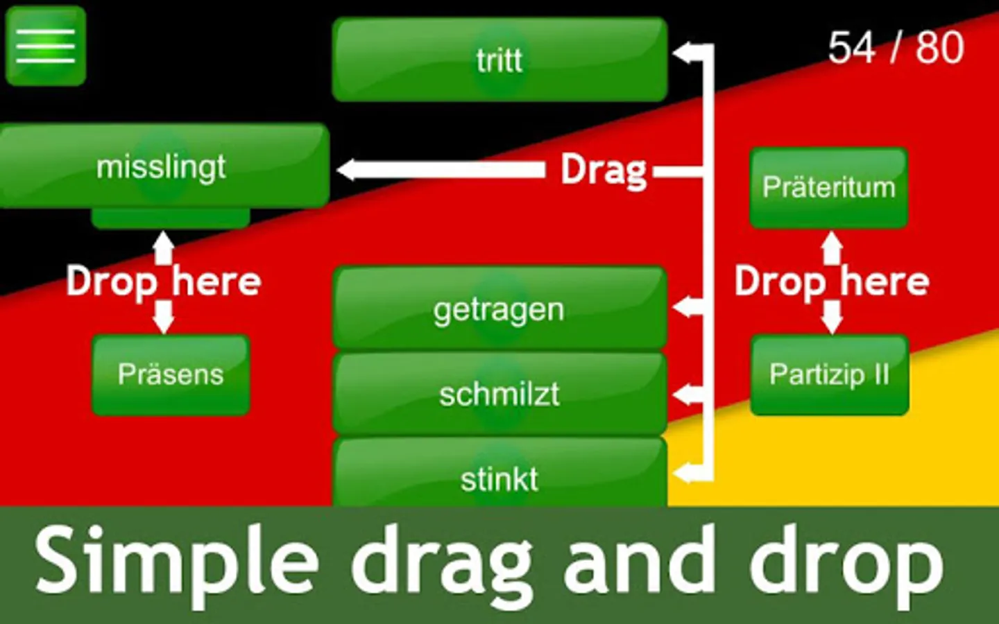 - "Compliance test" - where you need to drag and drop appearing verbs to the appropriate time for them: Infinitiv, Präsens, Präteritum or Partizip II.
