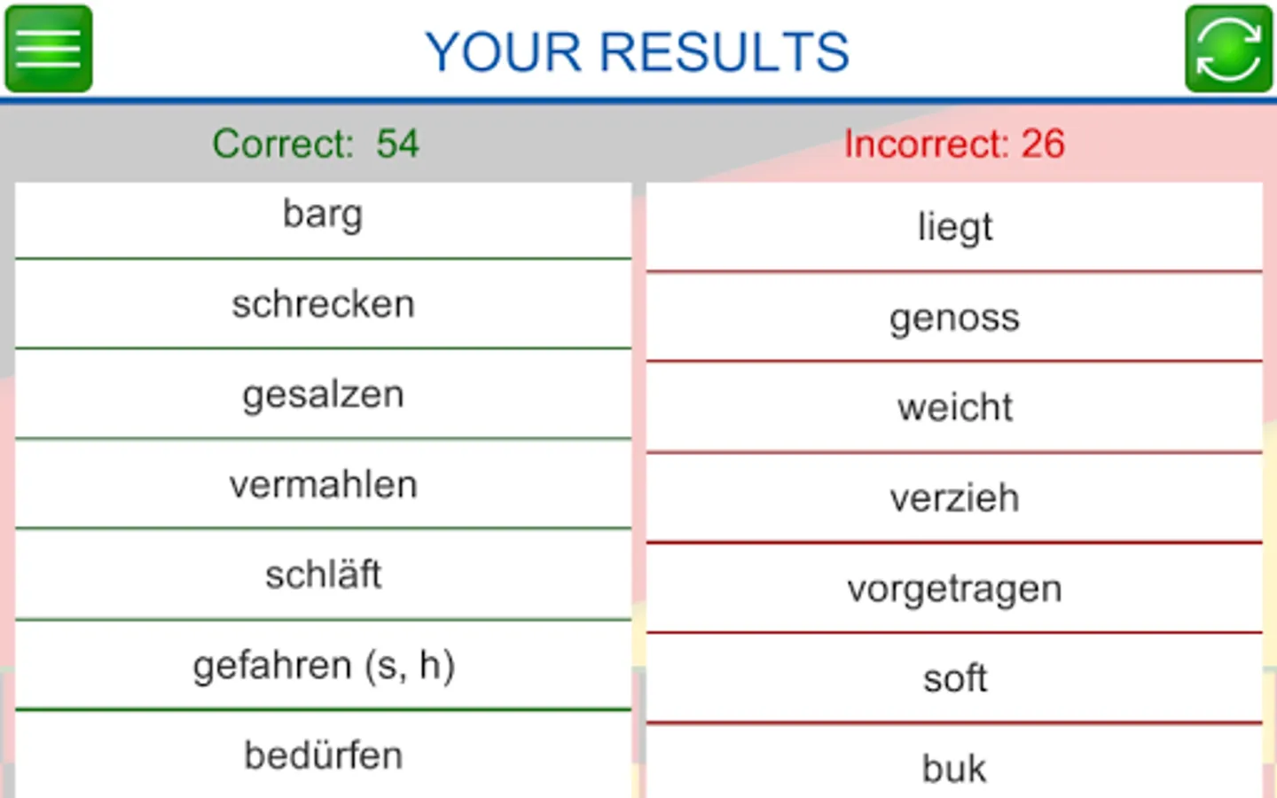 Each test mode has several difficulty levels: Easy, Medium, Hard and Super hard, which differ in the number of questions: 20, 50, 80 and 100, respectively. In the verbs test mode besides selecting the difficulty level you have the option to choose the times of verbs for testing. When you finish the test you can see the statistics of your answers, where you can view the correct and incorrect answers.