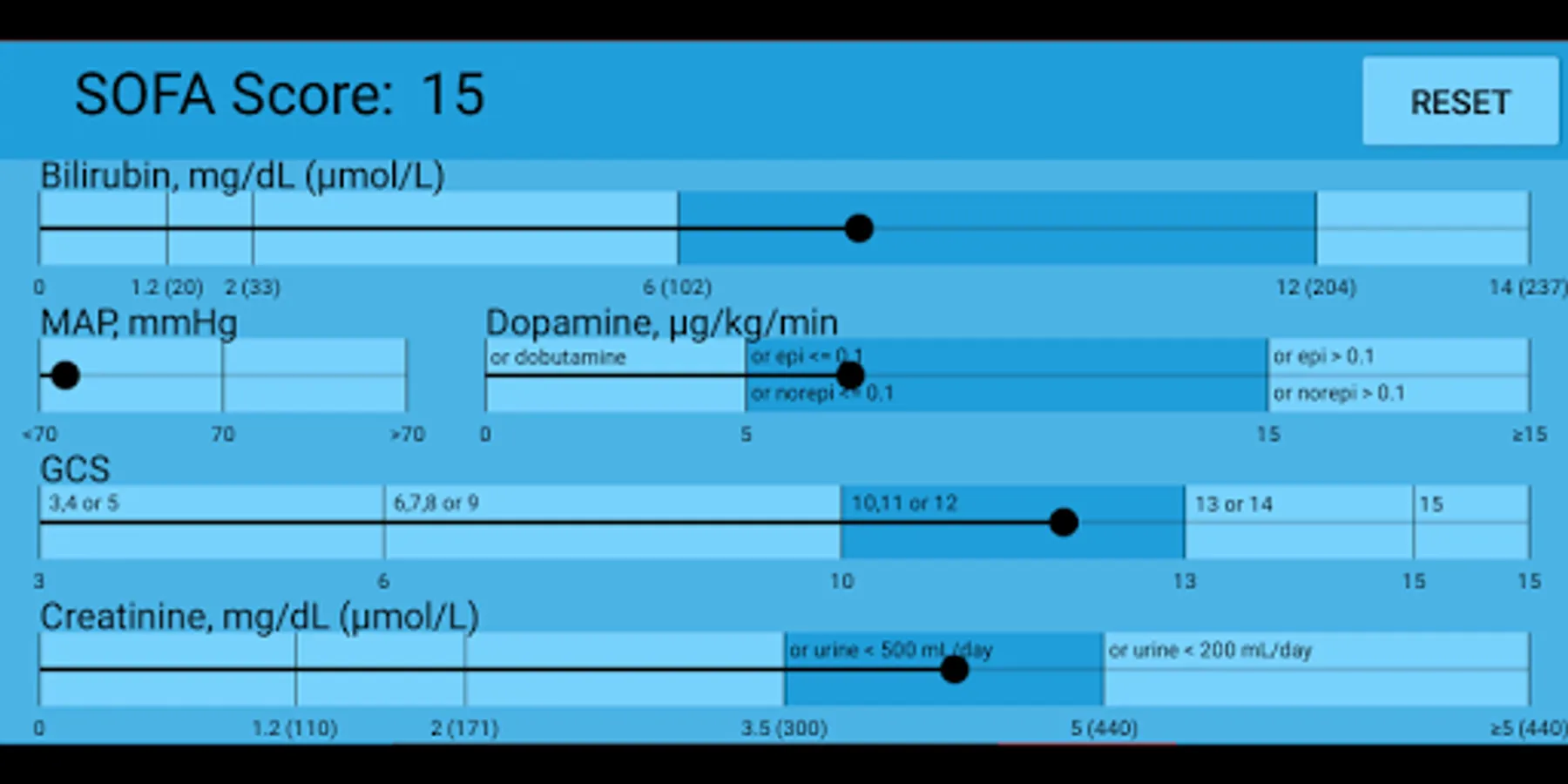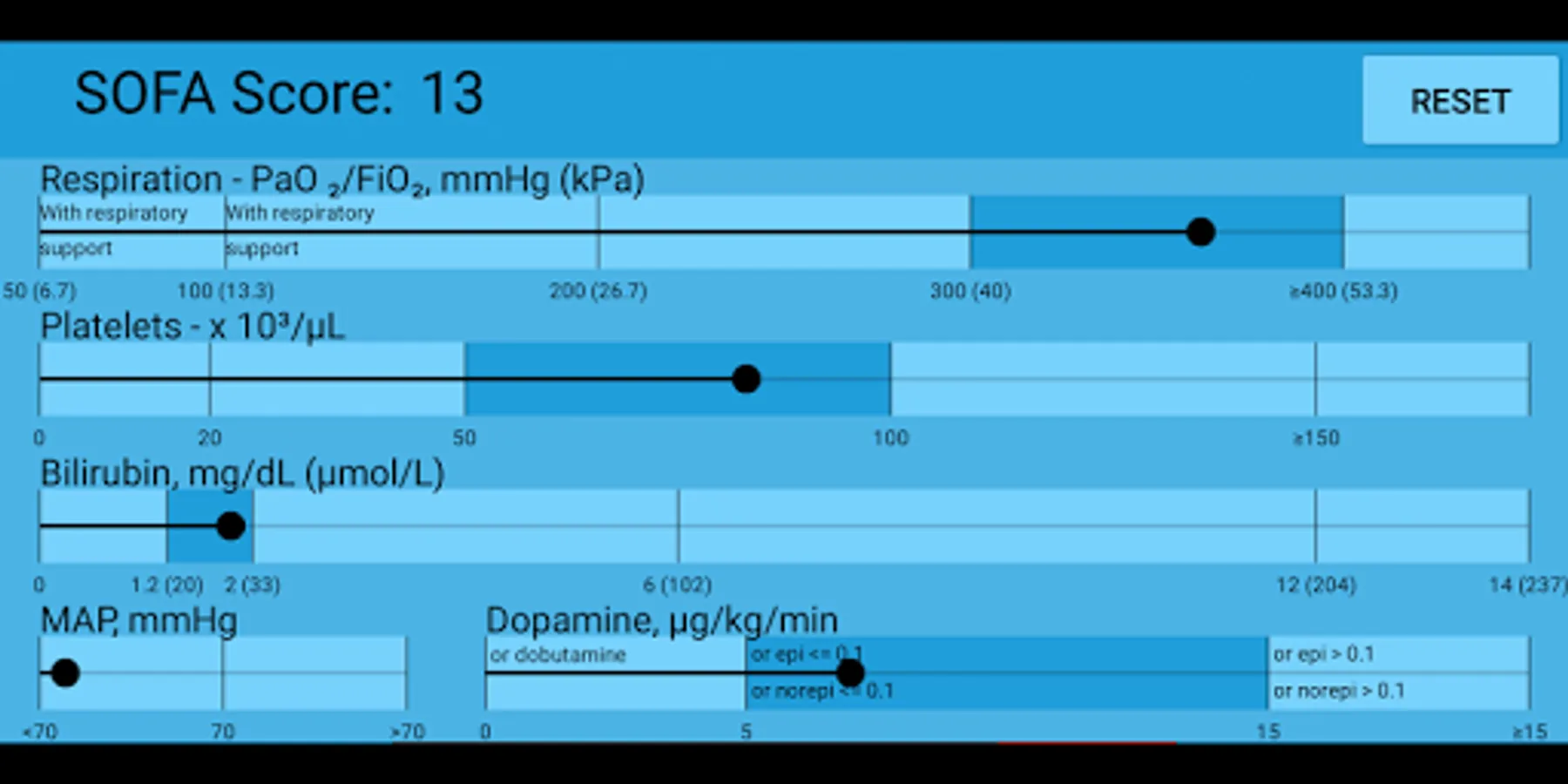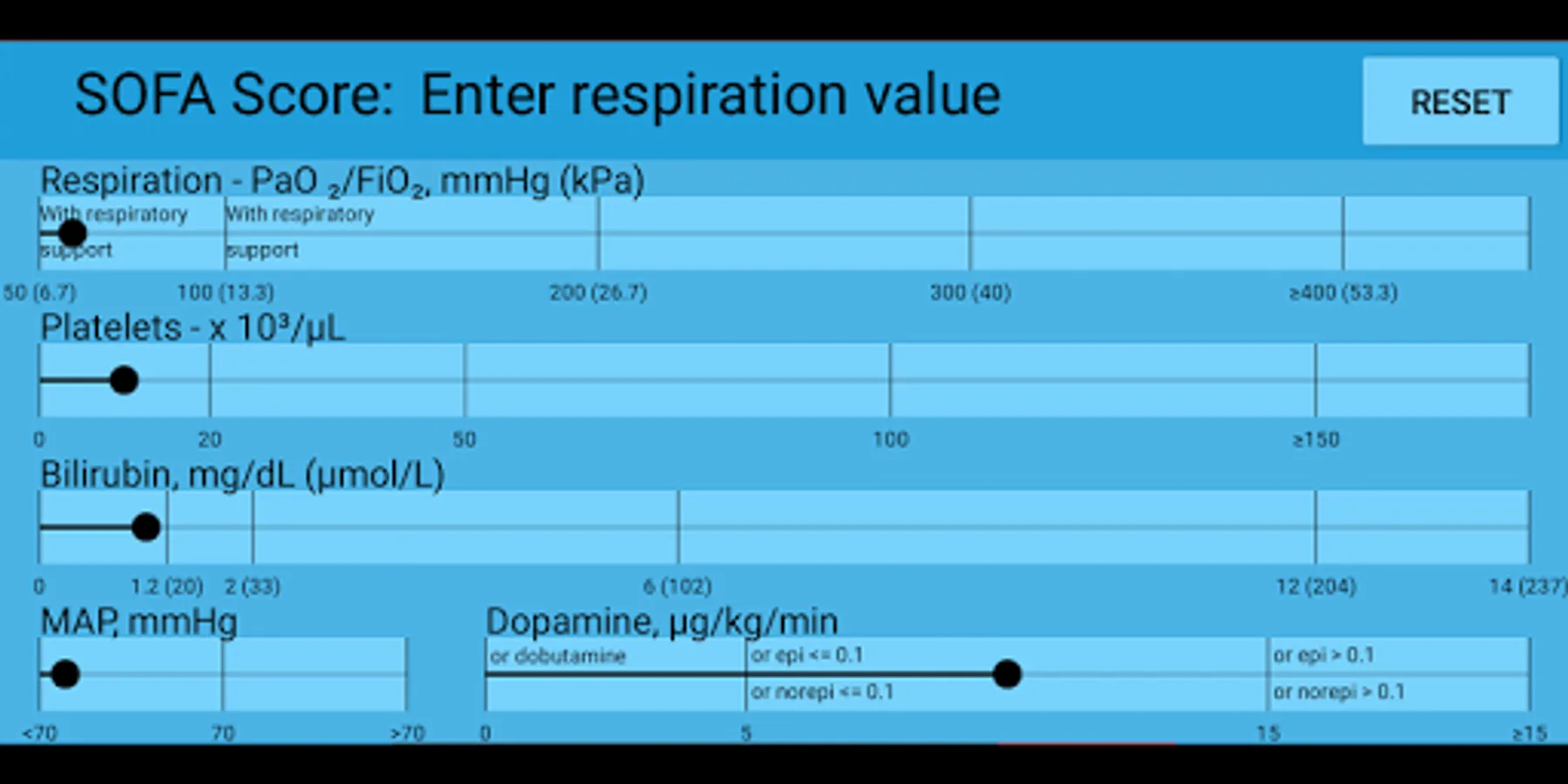Since the SOFA score uses intervals of values to determine the score it is not necessary to explicitely enter the exact values. Tapping the correct interval in which the value of your patient resides is enough to get the SOFA score. Therefore I thought it would be convenient to have a user interface in which you can use seekbars to select values instead of typing them. It saves me a bit of time and I hope it will save you some time as well doing the good work you do. Any suggestions are very welcome at gumptionmultimedia@gmail.com.