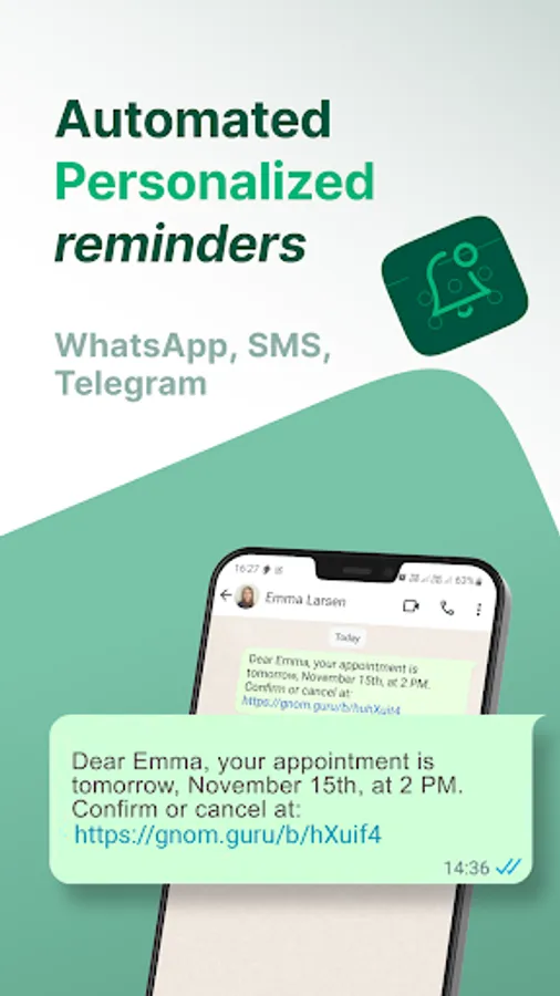 Send free automatic and PERSONALIZED reminders to customers via messengers (WhatsApp, WhatsApp Business, Viber, Telegram) or SMS*. There are a number of message templates available for sending reminders before and after the appointment.