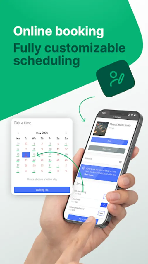 Having your own web page for online booking allows clients to quickly and easily schedule appointments. You can track new service requests in the app or via email. It is also possible to install an online booking widget on an existing website.