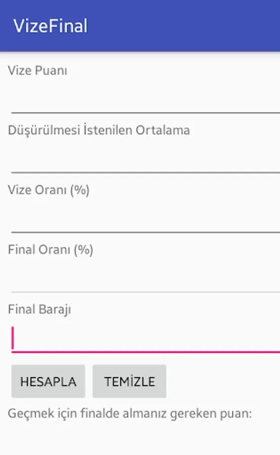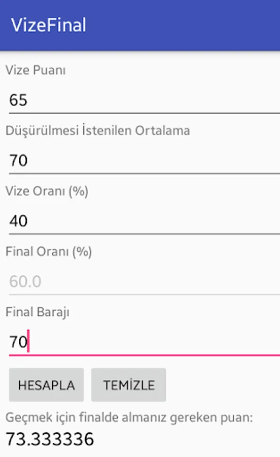 This programs helps the students to know how much to get in the final exam to pass a subject after knowing the vize exam.