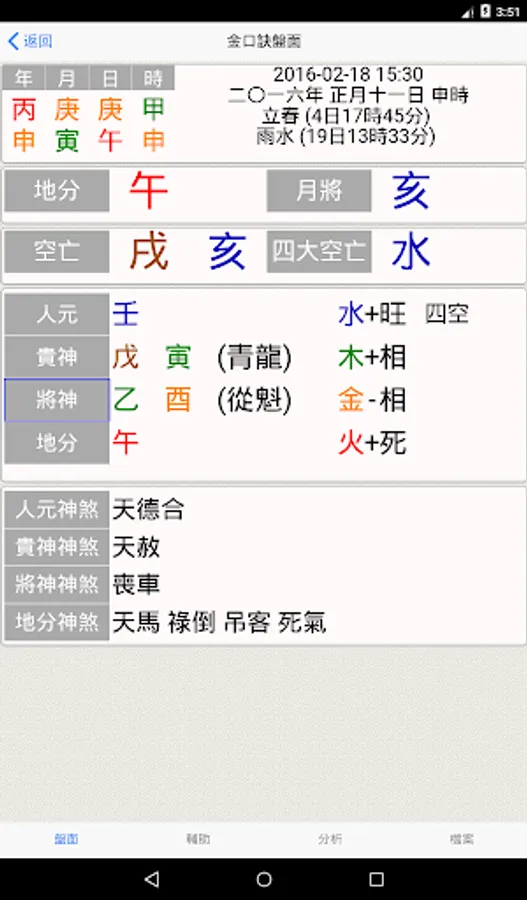 2. The corresponding four-column information, the solar energy information, the human element, the noble god, the god, the land, the moon, the air, and various related gods are displayed on the disk surface.