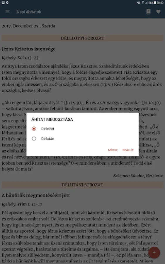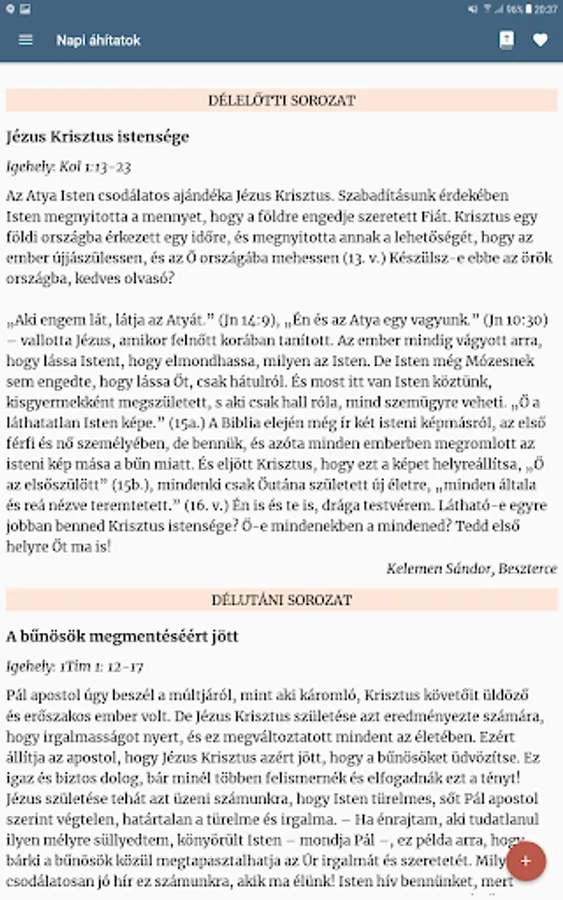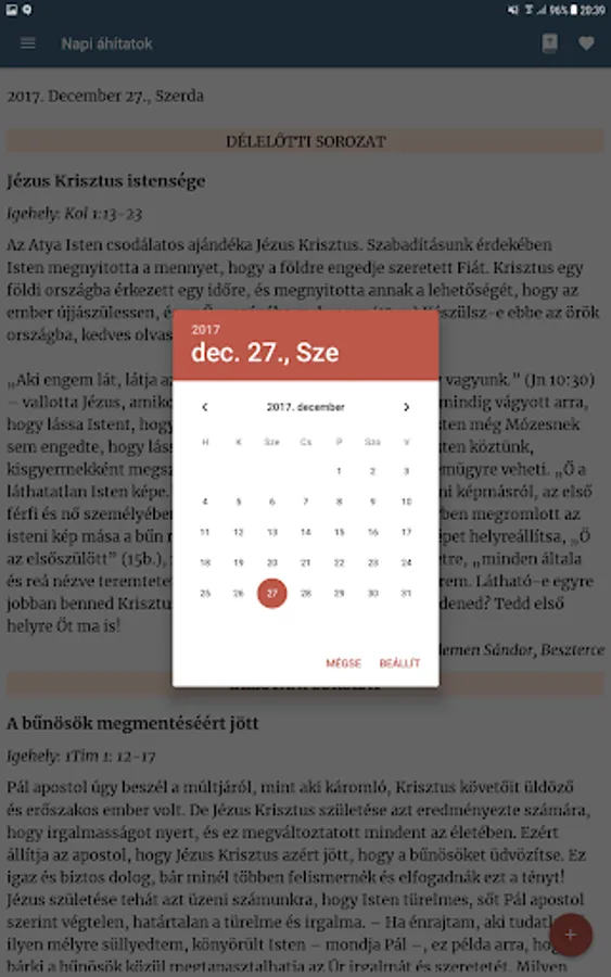 Bible reflections written by Transylvanian and partly Hungarian and North American Hungarian Baptist pastors and spiritual workers. Mobile version of annual devotional reflections printed by the Association of Hungarian Baptist Churches in Romania. You do not need an internet connection to run, except for the duration of the installation. Devotion can only be used on Android 4.3 or higher.