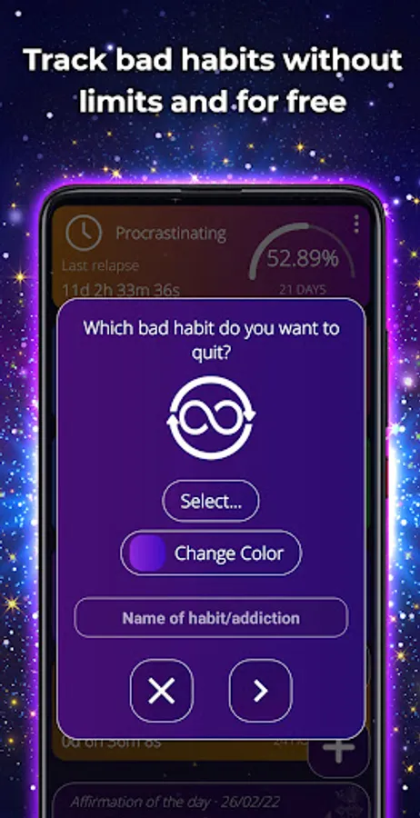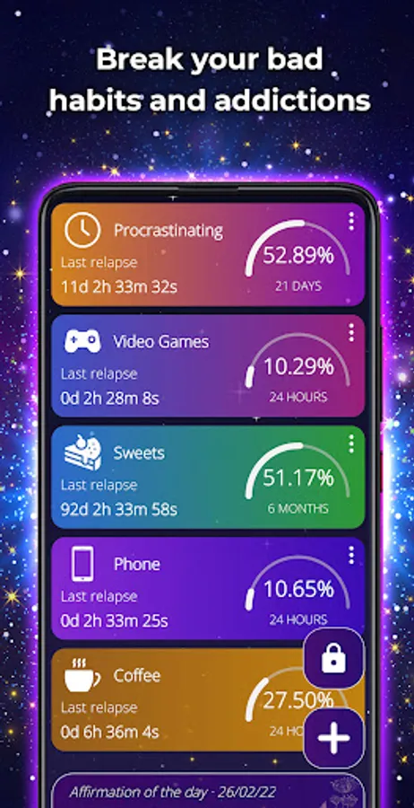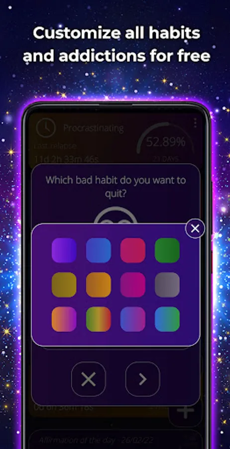 Unlike other apps, this application allows you to change the color of addictions whenever you want and totally free. There are a total of 12 gradients specially designed to match each other.