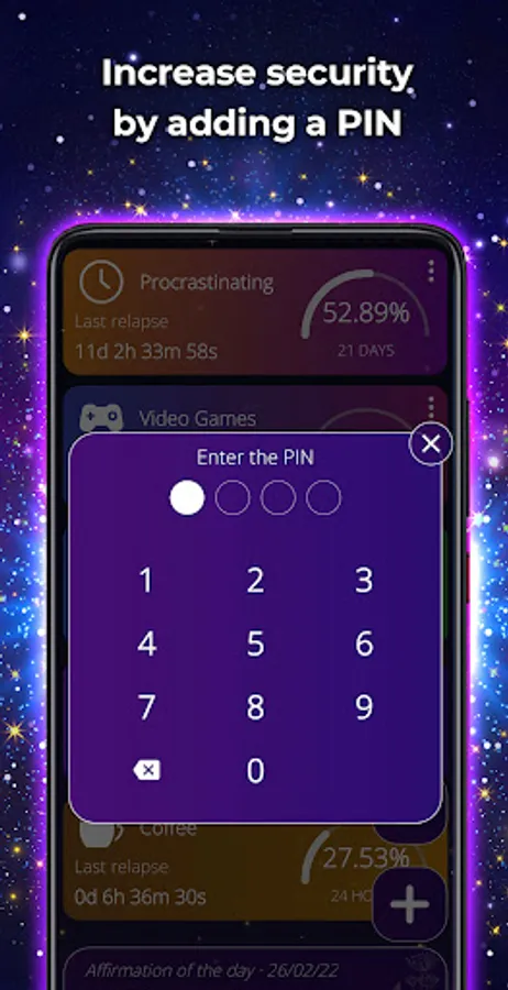 If you want to keep your privacy and no one can see what addictions you are trying to quit, the Security PIN is ideal for you. With just 3 steps, you will be able to create a code that will be requested every time you open the app.