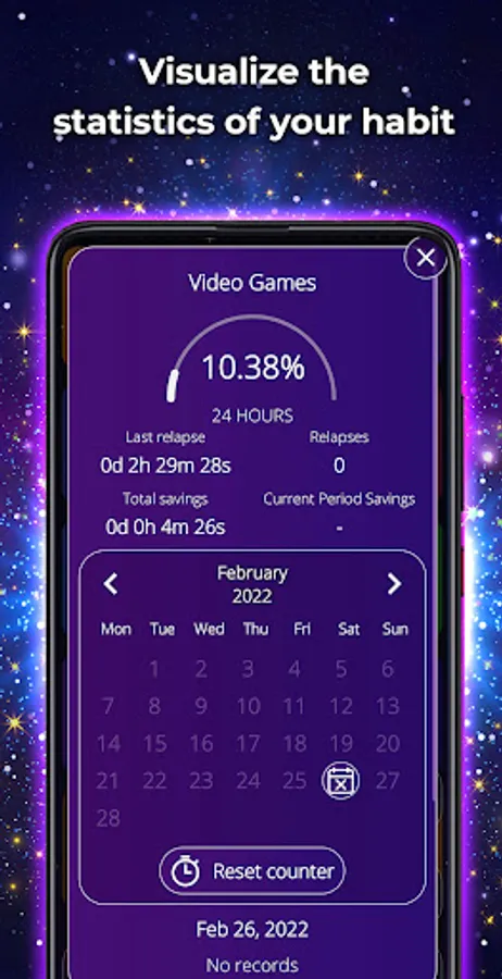 We have worked to create an intuitive app, so all the information has been condensed into a single view. The habits calendar shows all the relapses during the month. You can see all the time or money saved through abstaining and savings forecasts from the week to the century.