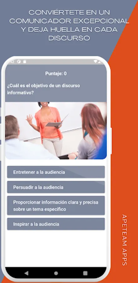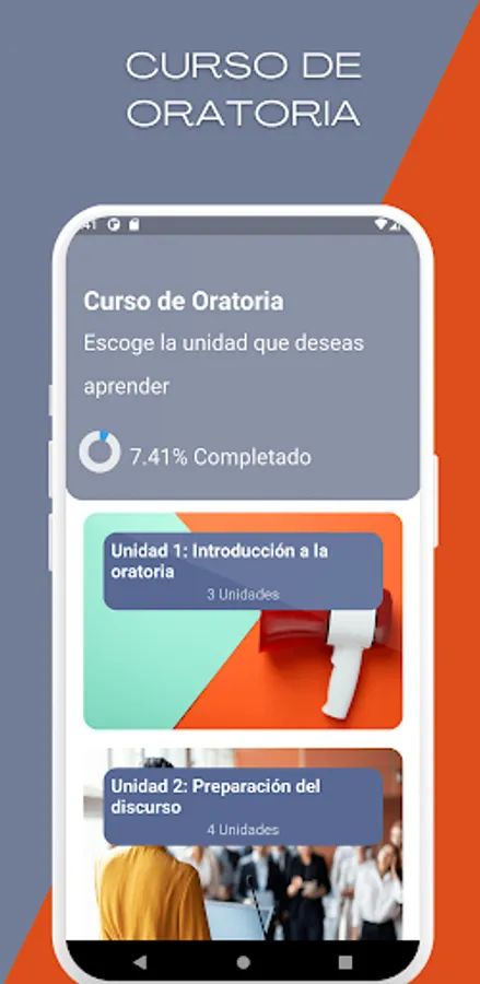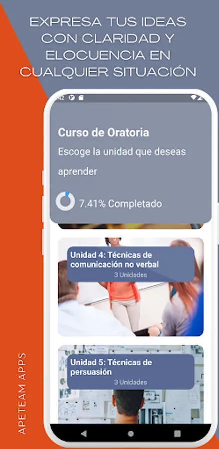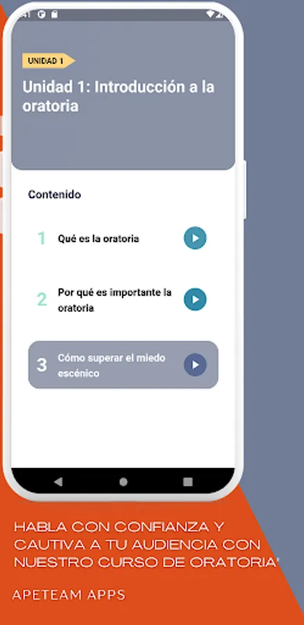 The application has eight thematic units, which include from the introduction to public speaking, verbal and non-verbal communication techniques, to the elaboration of informative, persuasive and motivational speeches adapted to the public. In addition, leadership topics such as human behavior, values, ethics and personal growth are addressed to help you develop your leadership skills in a team and in the organizational field.