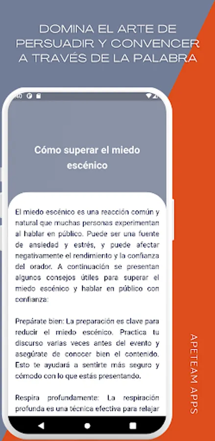 Public Speaking and Oratory is a mobile application that offers a complete leadership and public speaking course, with practical tools to improve your communication skills in special situations. With this leadership course, you will be able to learn soft skills such as non-verbal communication, oral and written expression, assertive communication and how to improve your diction to achieve public speaking with confidence and confidence.