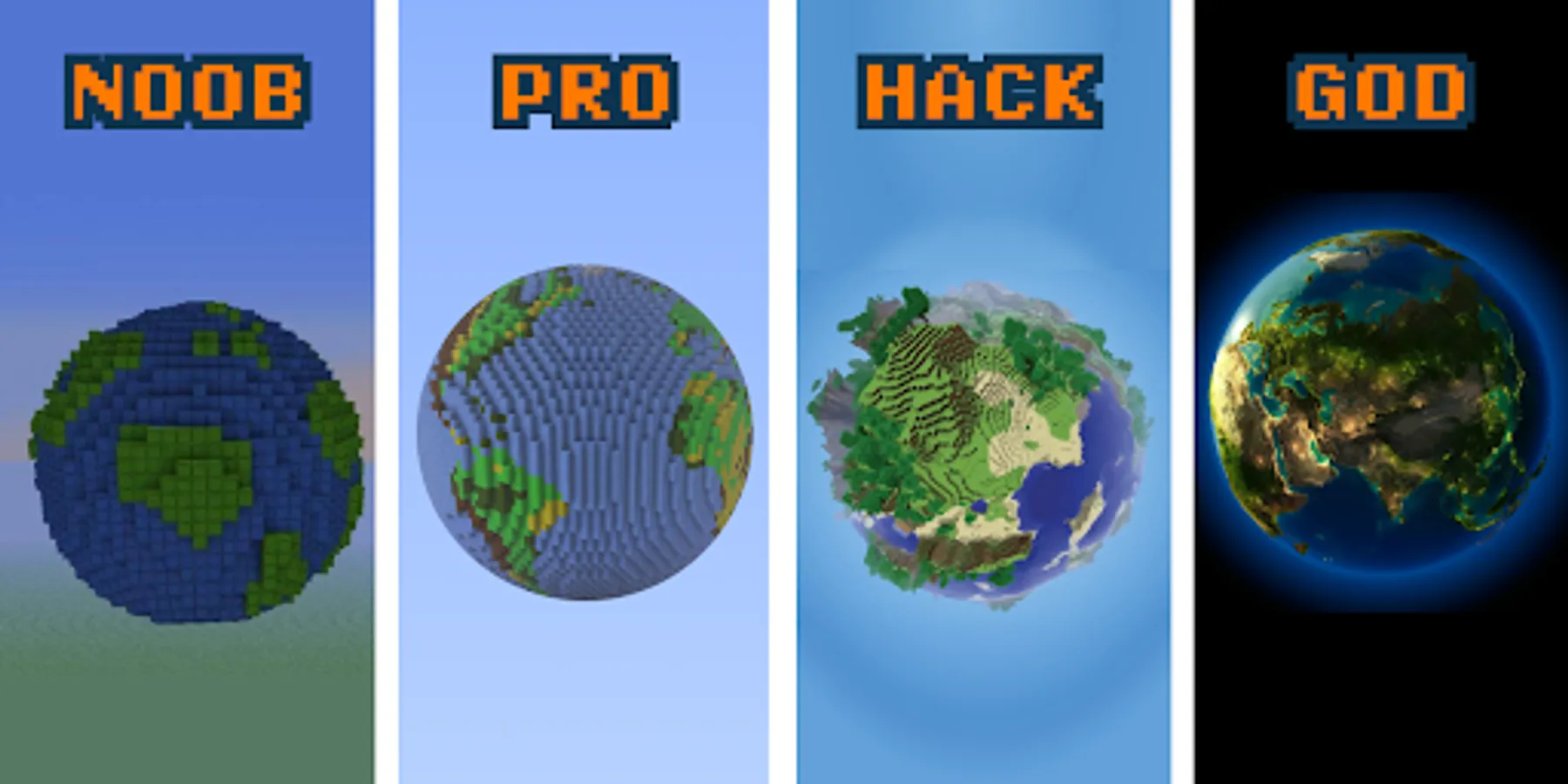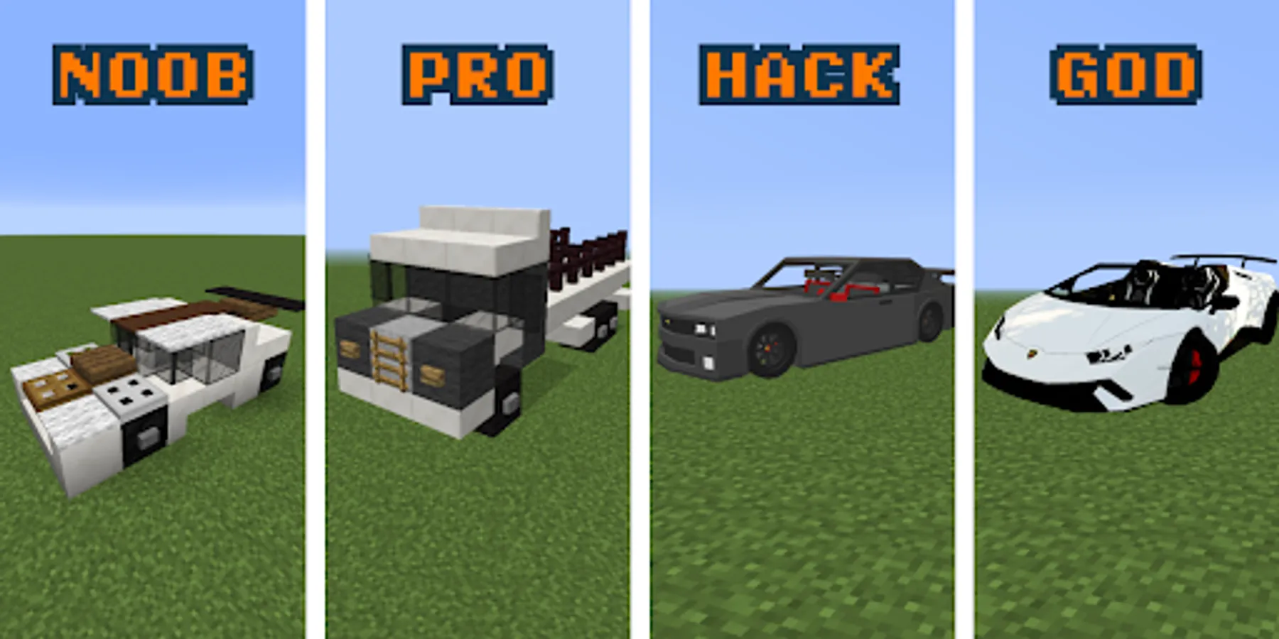 Noob vs Pro vs Hacker vs God for Minecraft is a unique update that will allow you to diversify the classic game and compete with other players in agility! Prove to everyone that you are not a weak beginner, but an experienced gamer! Call your friends and find out which of you is the best at building houses or killing scary mobs the fastest!