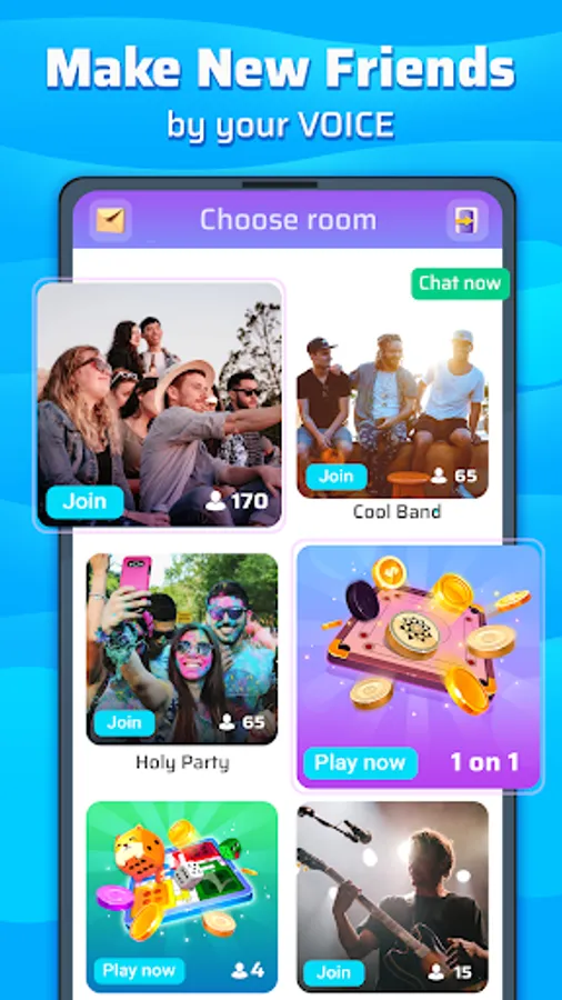 Let’s start the party! Create your own room, use text or voice to live chat with friends, play your favorite music, sing together, chat and enjoy the fun of a great voice chat party.